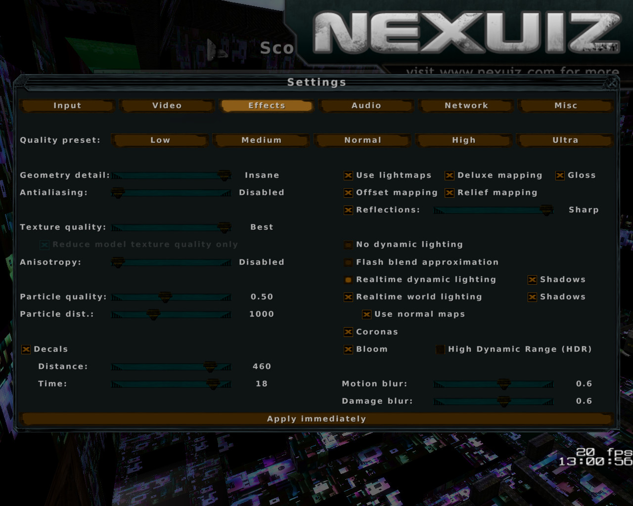 Created attachment 62013 [details] nexuiz settings.jpg These are the settings I use. Basicaly everything is enabled. On the video tab gl2 shaders and occlusion queries are enabled, vbos for vertices and triangles and texture compression is set to good. If I disable offset mapping, texturing returns to normal. Relief mapping is indifferent, and so are all the other settings.