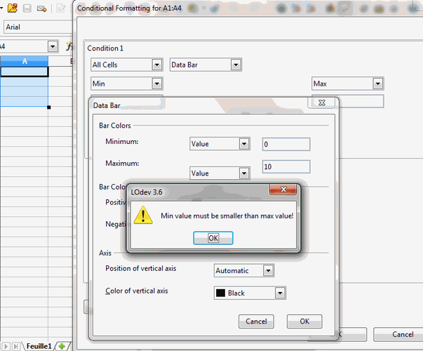 Created attachment 63938 [details] Screenshot after step 8 Hello Steps to reproduce : 1. File> New> Spreadsheet 2. Select A1:A4 3. Format> Conditional formatting> Conditional formatting 4. Add> Condition1 : All Cells> DataBar 5. Click More options 6. Minimum, select "Value" in the list, let 0 in the value zone 7. Maximum select "Value" in the list, replace 0 by 10 in the value zone 8. Ok Expected result : dialog closes, min and max value used Actual result : error message "Min value mut be smaller than max value!" See screenshot after step 8 Platform : windows 7 64 bits & Version 3.6.0.0.beta3 (Build ID: 3e2b862) Regards Pierre-Yves