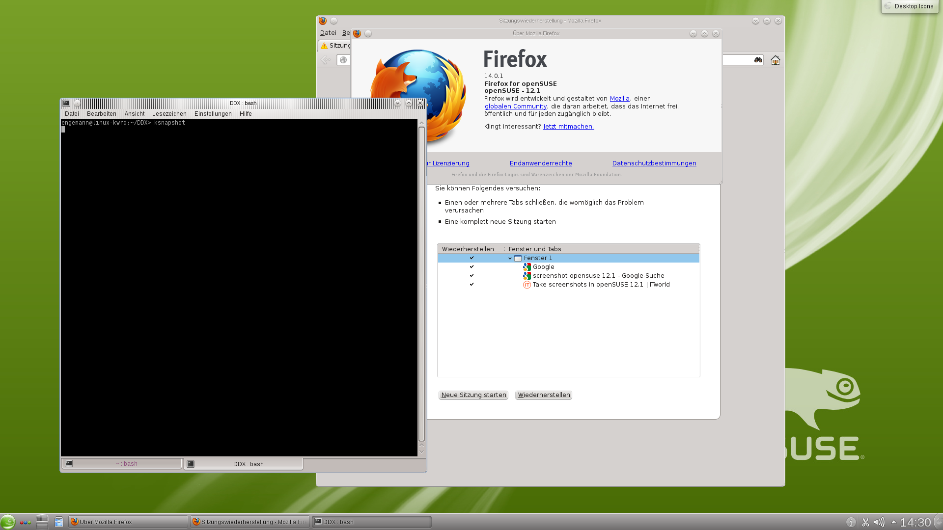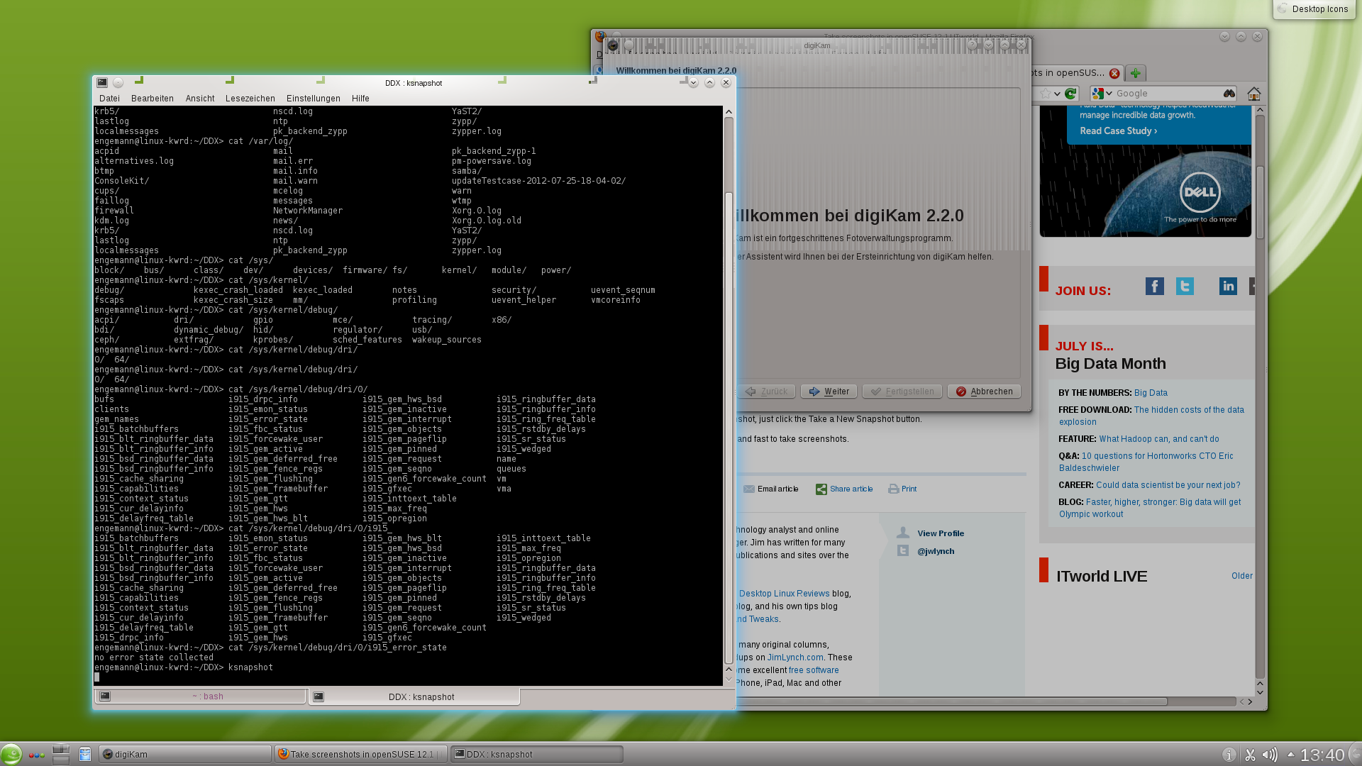 Sure we can do some experimentation ... 1) I already tried Kernel 3.4.4 (not self compiled) from OpenSuse Repo (http://download.opensuse.org/repositories/Kernel:/stable/standard/) Nothing exploded ... things got even better. I even got rid of some "hangcheck timer elapsed" messages. 2) I'm willing to compile Kernel / DDX. So if you could give me some advice which version of drivers I should compile respectively which combination of Kernel / ddx ...