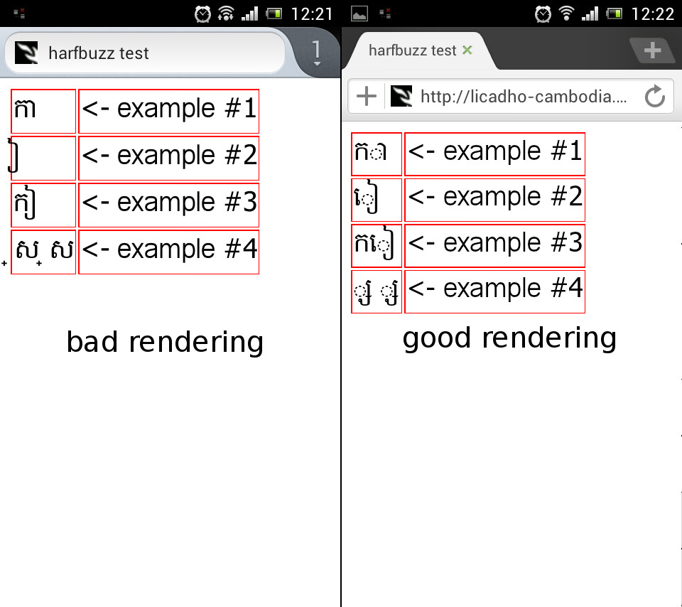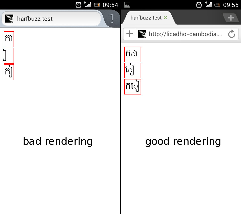 Created attachment 65751 [details] testcase rendering : harfbuzz on firefox vs android stock (not sure what its using to render khmer script)