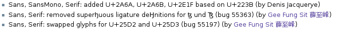 (In reply to comment #7) > It seems that after this change there are ligature problems. I'm using > Dejavu Sans in Linux and Firefox. I attached a screenshot above. Did you try restarting Firefox after you updating the font? Firefox will show glyphs with the previous order unless you restart it. For example if the font had the glyphs a, c and you update the font with a, b, c, (adding b right after a, changing the index number of c) then Firefox will show b instead of c.