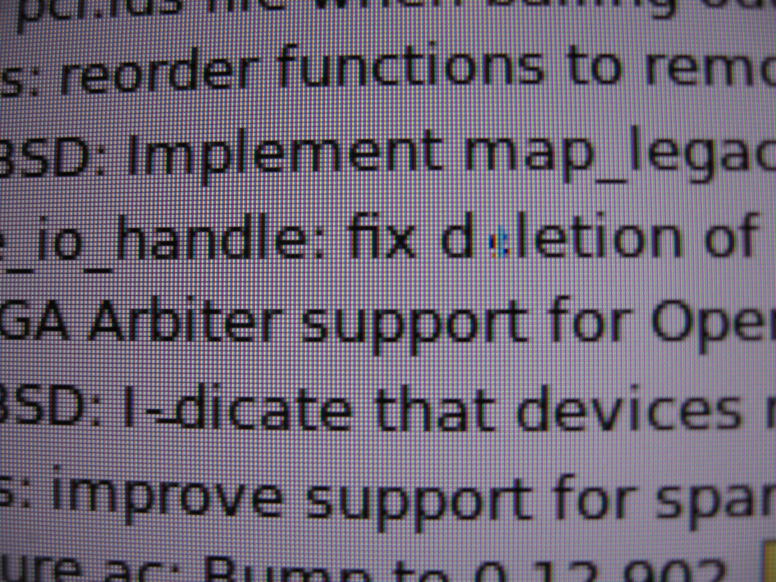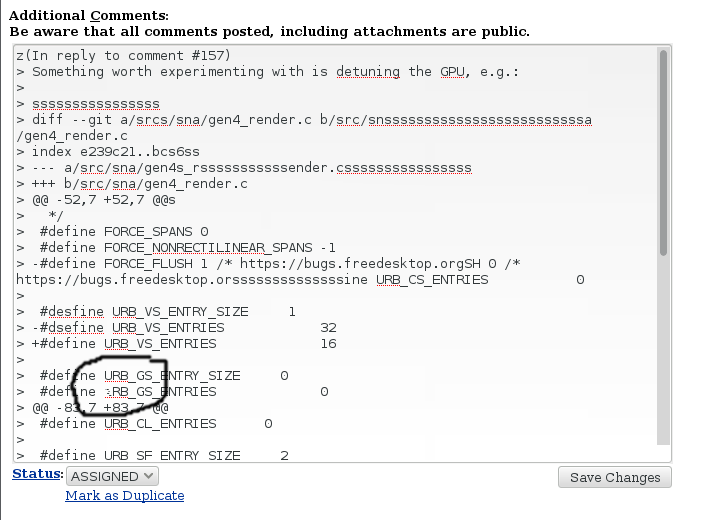 Created attachment 82369 [details] Handy phone snapshot of artifacts on chars post drm/i915 fix: Only clear write-domains after a successful wait-seqno This is an example of the artifacts on chars, still happening running a kernel with the drm/i915 fix 'Only clear write-domains after a successful wait-seqno'. In this case we have a completely mangled 't' in firefox. Snapshot was taken with an handy phone so that the monitor pixel frame is visible. In fact, it is now apparently impossible to snapshot with prtscrn. As soon as a print screen is requested the wrong char is always redrawn correctly.