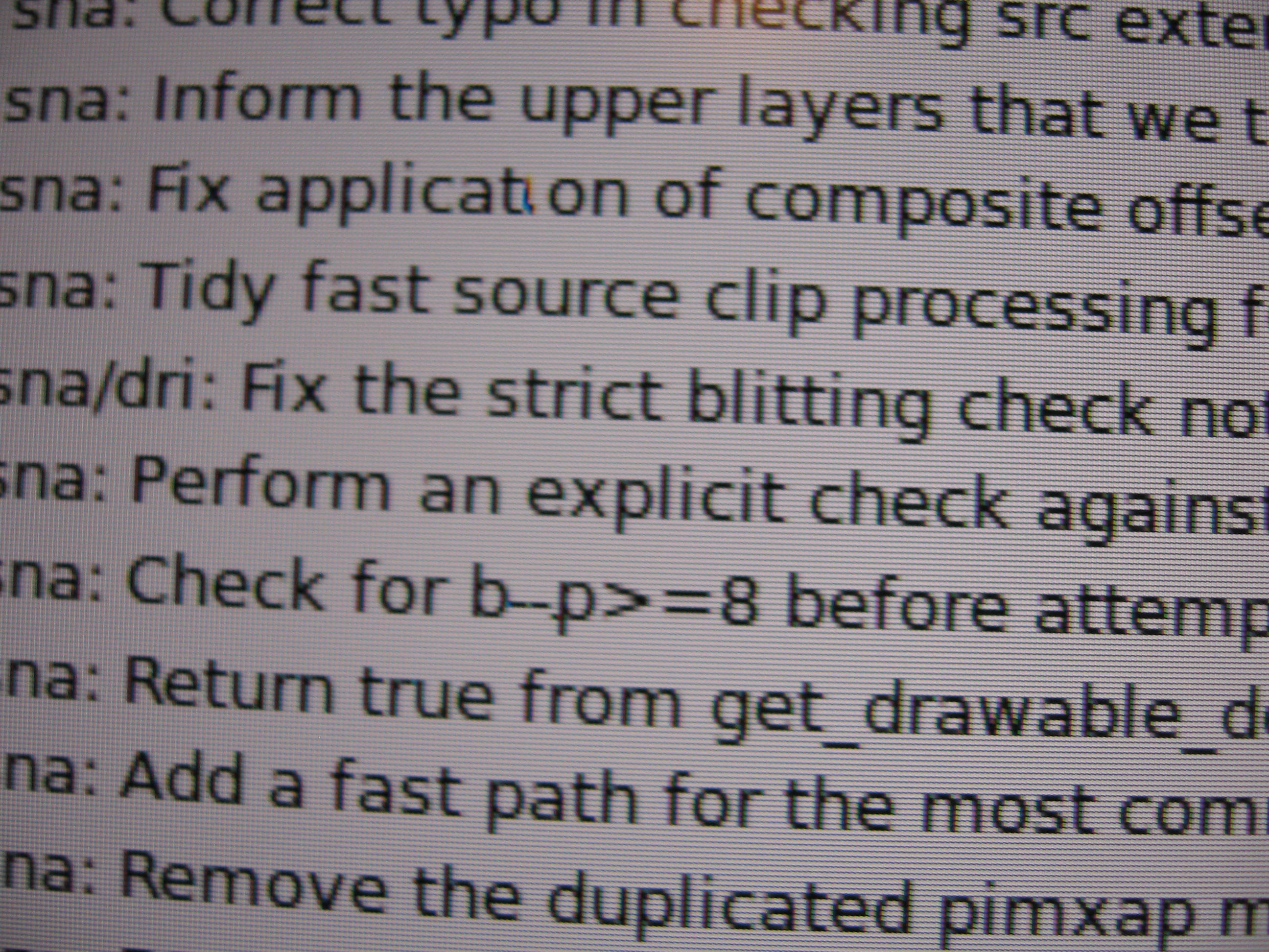 Ok - seem(In reply to comment #170) > Created attachment 92288 [details] > bug > > f23ab963c4f4ada2051588dfc85264aa2798dbf7 + that patch and I'm seeing > corruption. Using google-chrome and letters in url bar or window title bar > sometimes get corrupted and then get fixed. > > Also seeing the problem in gimp menus. Some letters get corrupted and fixed. This could be related to my hw: [219745.896] (II) intel(0): SNA compiled with assertions enabled [219745.898] (--) intel(0): Integrated Graphics Chipset: Intel(R) 965GM [219745.898] (--) intel(0): CPU: x86-64, sse2, sse3, ssse3 [219745.898] (**) intel(0): Depth 24, (--) framebuffer bpp 32 And Arkadiusz hw: [236338.852] (II) intel(0): SNA compiled with assertions enabled [236338.853] (--) intel(0): Integrated Graphics Chipset: Intel(R) GM45 [236338.853] (--) intel(0): CPU: x86-64, sse2, sse3, ssse3, sse4.1 [236338.853] (==) intel(0): Depth 24, (--) framebuffer bpp 32 On my 965GM I've not yet seen any error....