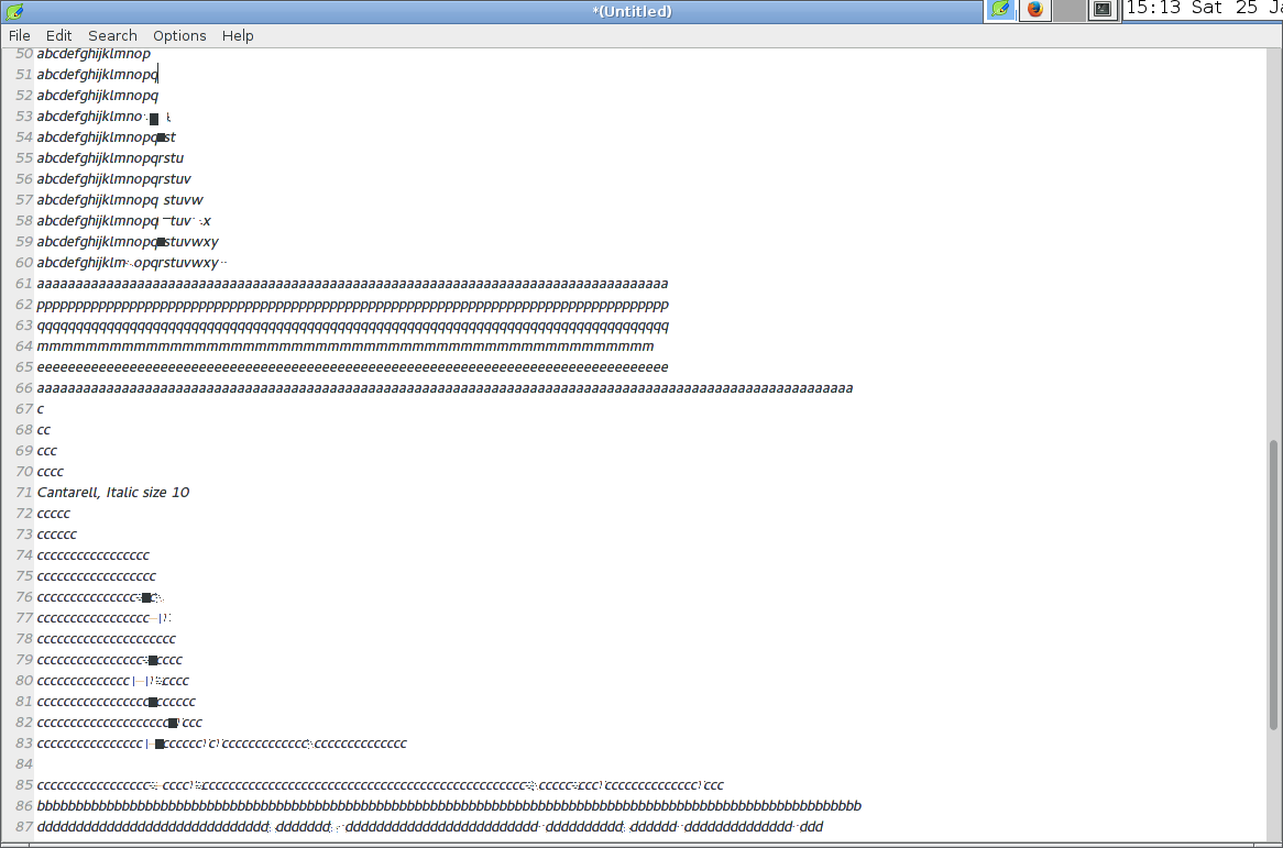 Created attachment 92770 [details] not quite random corruption example With the workarounds disabled, can anything be deduced from the text or pixmap corruption not seeming to be completely random? Italic text seems to be particularly badly hit, and it seems to vary with the font and size. But in the attached screenshot, some of the lines of text never showed any corruption, while others usually showed some corruption, the corruption changing on switching focus to another window and back. Size 10 italic Cantarell seemed particularly badly hit, with even lines of just repeated c or d characters showing corruption (if longer than 18 letters), but other fonts don't usually show any corruption on a line of text filled with a single repeating character. For pixmap corruption, the printer icon in the gedit toolbar seems to get turned into grey vertical bars more often than any other icons get corrupted.