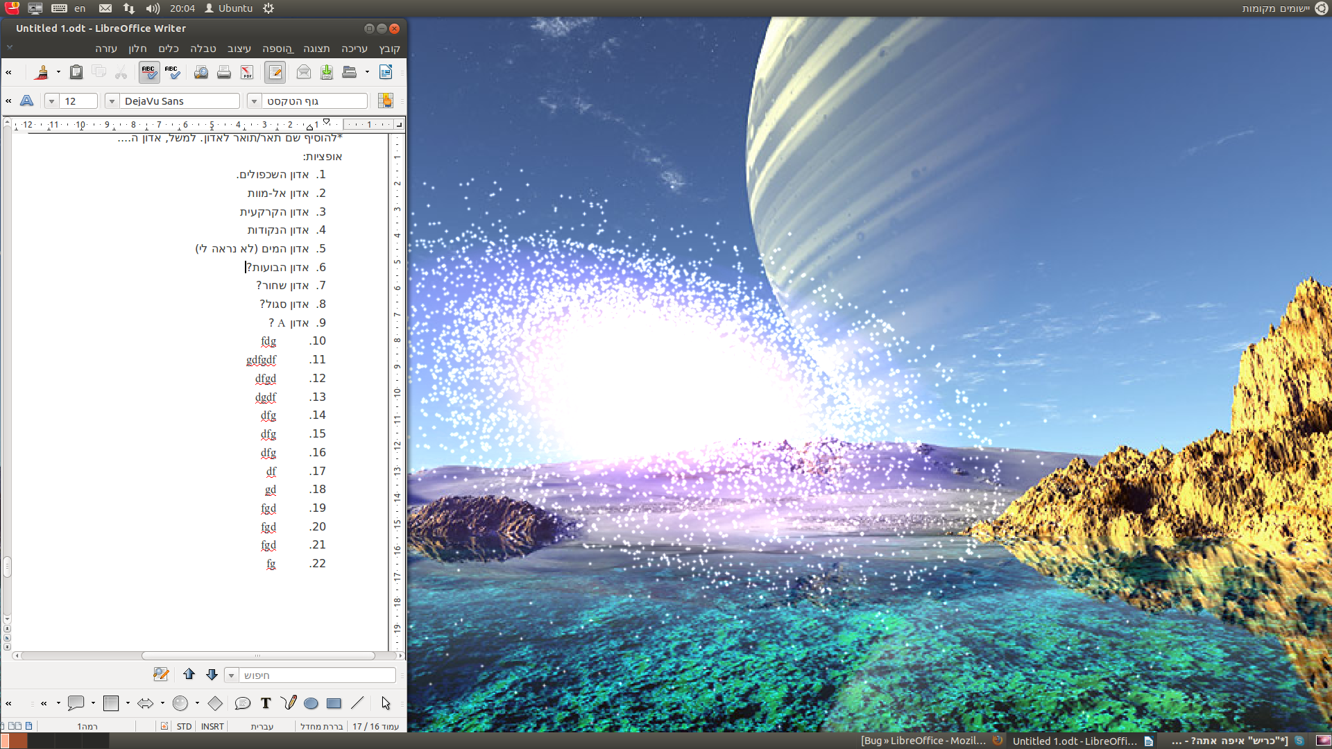 Created attachment 71400 [details] you can see the document in the left Problem description: look at list down here, I'll fill it till ten to describe: Steps to reproduce: 1. .... 2. .... 3. .... 4. bla bla 5. bla bla . bla bla . bla bla . bla bla 9. bla bla 10. bla bla 11. bla bla 12. bla bla . bla bla . bla bla . bla bla and so on. getting to the object number twenty in the list is the same, so it may not be relate to every Tenth object. here a copy from my document-it's in Hebrwe: אופציות: 1. אדון השכפולים. 2. אדון אל-מוות 3. אדון הקרקעית 4. אדון הנקודות 5. אדון המים (לא נראה לי) 6. אדון הבועות? 7. אדון שחור? 8. אדון סגול? 9. אדון A ? 10. fdg 11. gdfgdf 12. dfgd 13. dgdf 14. dfg 15. dfg 16. dfg 17. df 18. gd 19. fgd 20. fgd 21. fgd 22. fg well, you may not see it exectly, here a picture: http://i.imgur.com/FrBfD.jpg if you have some question, here is my gmail: yinonzadok@gmail.com if there someone who knows hebrew, it's better (: Current behavior: Expected behavior: Operating System: Ubuntu Last worked in: unspecified