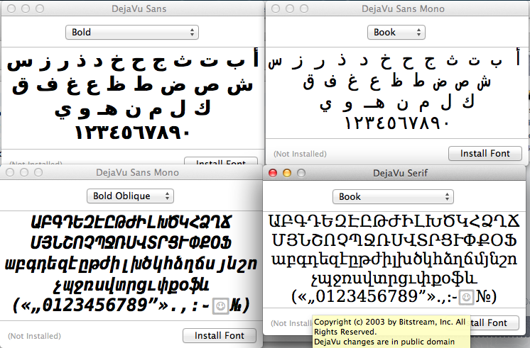 Created attachment 73178 [details] Preview of fonts when attempting to install 2.33 on fresh copy of OSX 10.8.2 When I try to install the Dejavu 2.33 fonts on a fresh install of OSX 10.8.2 I get some strange results. The letters from the English alphabet are displaying non-english characters. The LGC version has similar issues with the LGC Sans family.