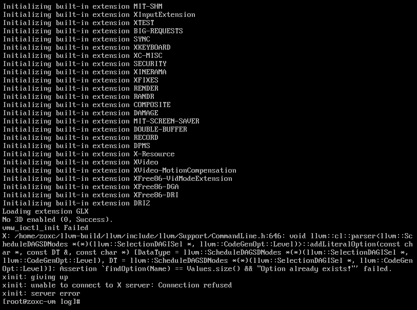 Created attachment 75418 [details] LLVM Assertion I get an LLVM assertion when running startx in VMware. This applies to git (I tried commit 7ae6864f0dbec33270c83c4181a8182139662d0f) and Arch Linux's 9.1 packages.