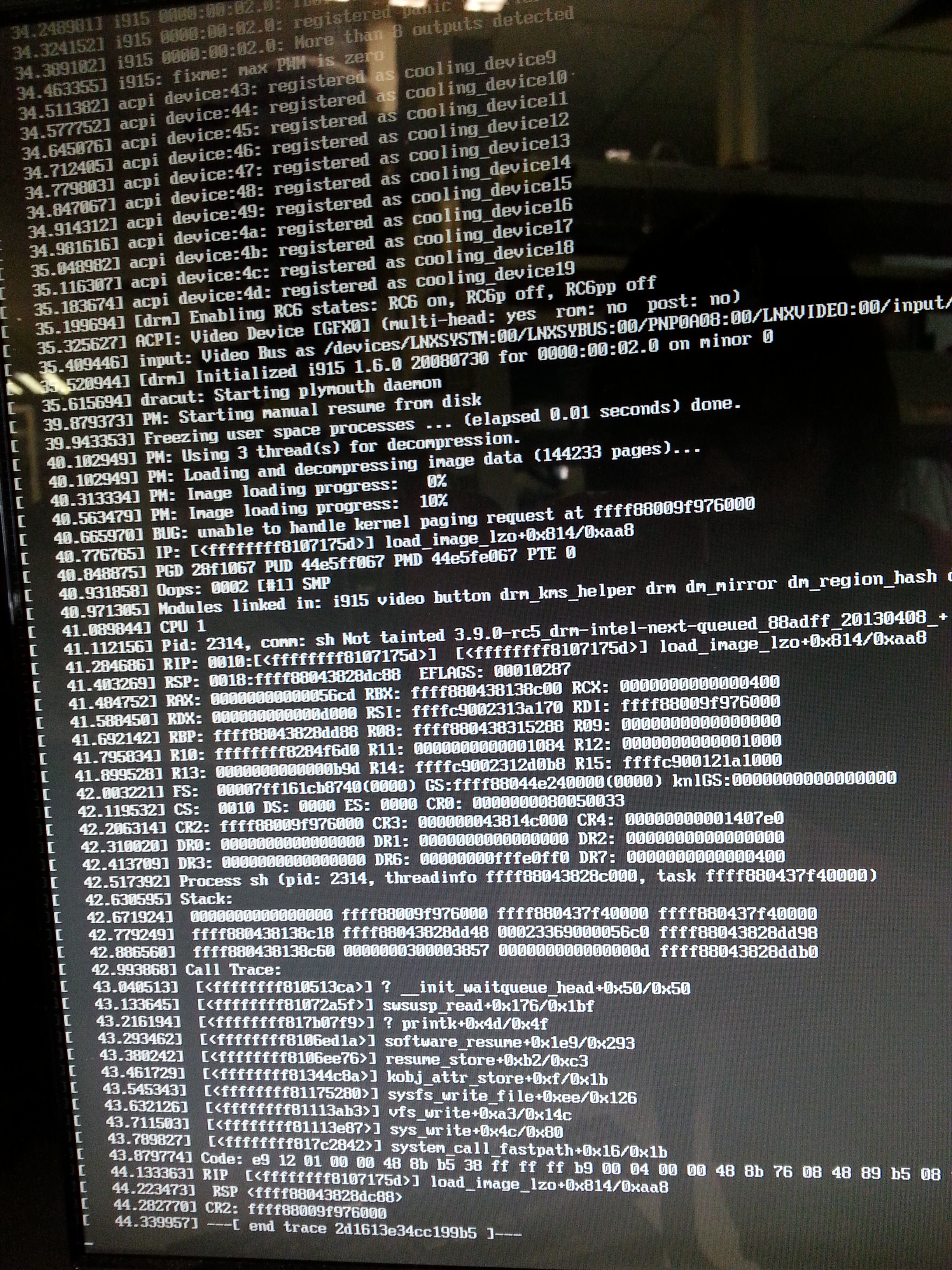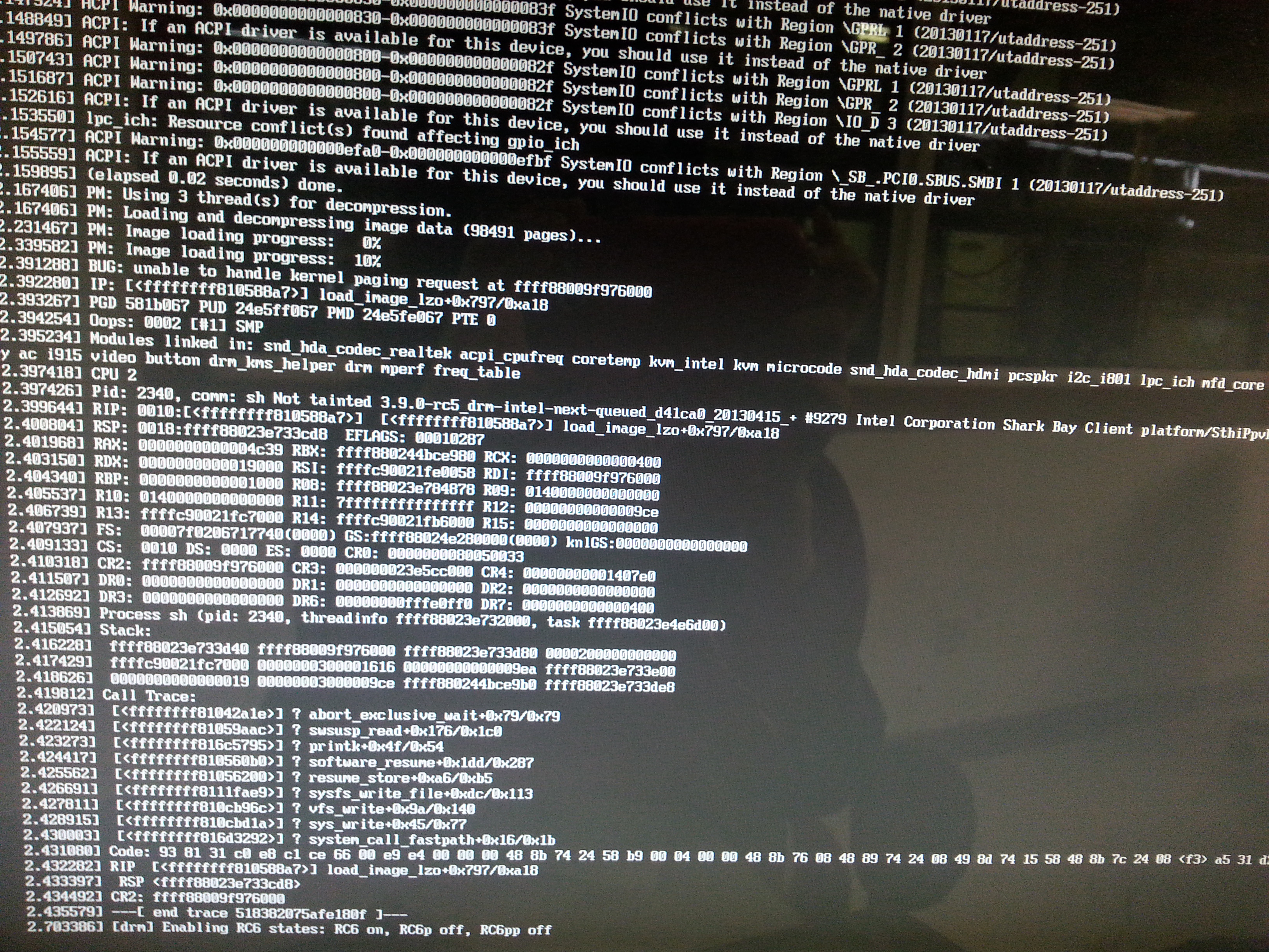 Bugzilla – Bug 63586[HSW ULT desktop mobile bisected] Resume from s4 causes call trace and system hang, with cold bootLast modified: 2017-10-06 14:46:43 UTC