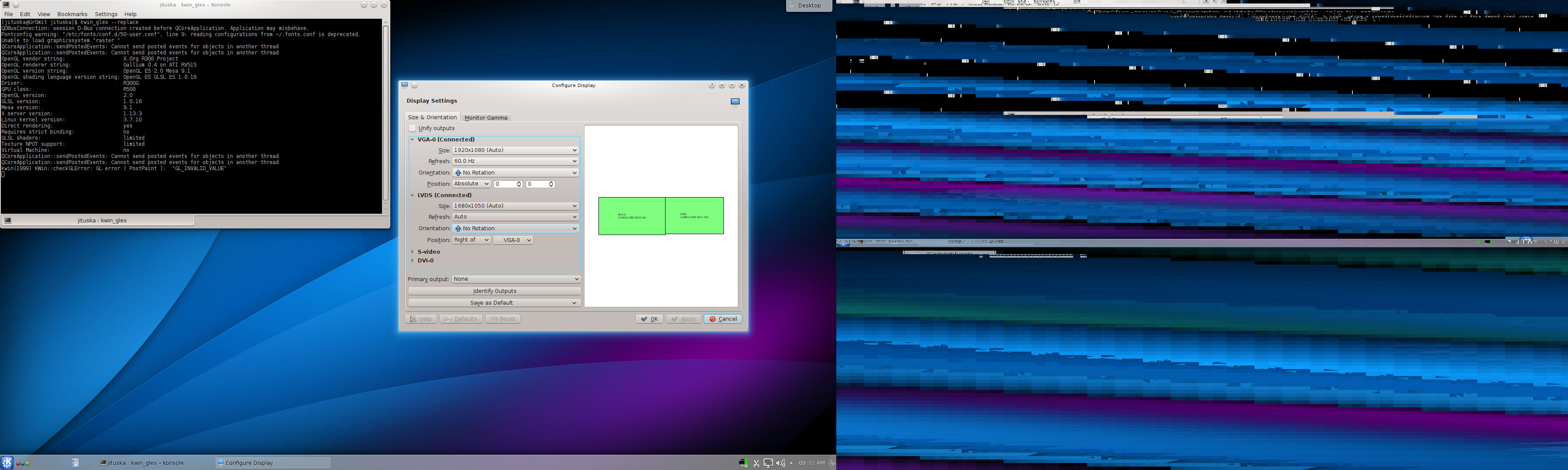 Created attachment 78244 [details] Dualdisplay bug. Hello, with radeon driver and mesa in version 9.1.1 I have problem with switching display between notebook and external display in KDE 4.10.2 with kwin_gles compositor in compositing type OpenGL. Setting dual display (left/right/above) or switching between displays, causes broken screen. Please, check attached screenshot. Downgrading to mesa version 9.0.2 solve this problem. With intel GPU/Driver is everything OK. KDE version 4.10.2 GPU: ATI x1400, driver - radeon Kernel: 3.8.7 mesa version: 9.1.1 ati-dri version: 9.1.1