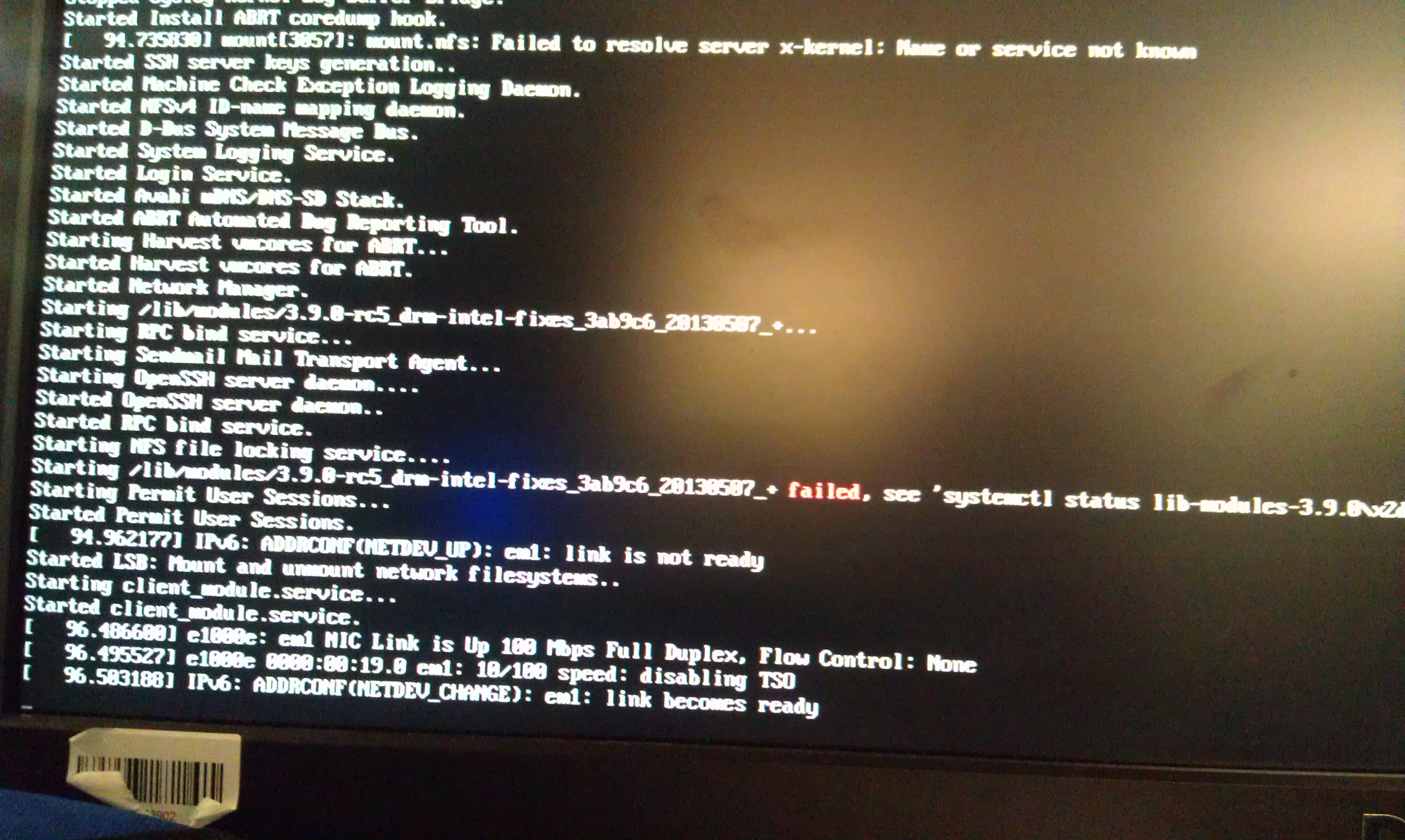 (In reply to comment #4) > Created attachment 78979 [details] > hang picture > > Fixed on Haswell by this patch. > This patch caused by system boot fail on ivybridge and sandybridge. Hm. From the only error message on the screenshot I assume there was an error while loading the kernel modules. Are you sure you installed the proper ones? If you made sure you have the proper modules in place: you have ssh server running, so could you ssh-in and get the dmesg? If not we'd need a netconsole log.