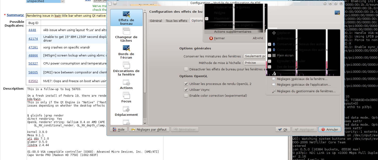 Created attachment 78948 [details] Screenshot of the issue This is a follow-up to bug 59703. On a fresh install of Fedora 19, there are rendering issues of the title bar in kde/kwin. This is only if the Qt Engine is "Native" ("Raster" works well). I have different issues depending on whether the desktop effects are enabled or not, most visible being without desktop effects. $ glxinfo |grep render direct rendering: Yes OpenGL renderer string: Gallium 0.4 on AMD CAPE VERDE GL_NV_conditional_render, GL_NV_depth_clamp, GL_NV_fog_distance, kernel 3.9.0 Mesa 9.1.1 ati ddx 7.1.0 glamor 0.5.0 libdrm 2.4.44 01:00.0 VGA compatible controller [0300]: Advanced Micro Devices, Inc. [AMD/ATI] Cape Verde PRO [Radeon HD 7750] [1002:683f]