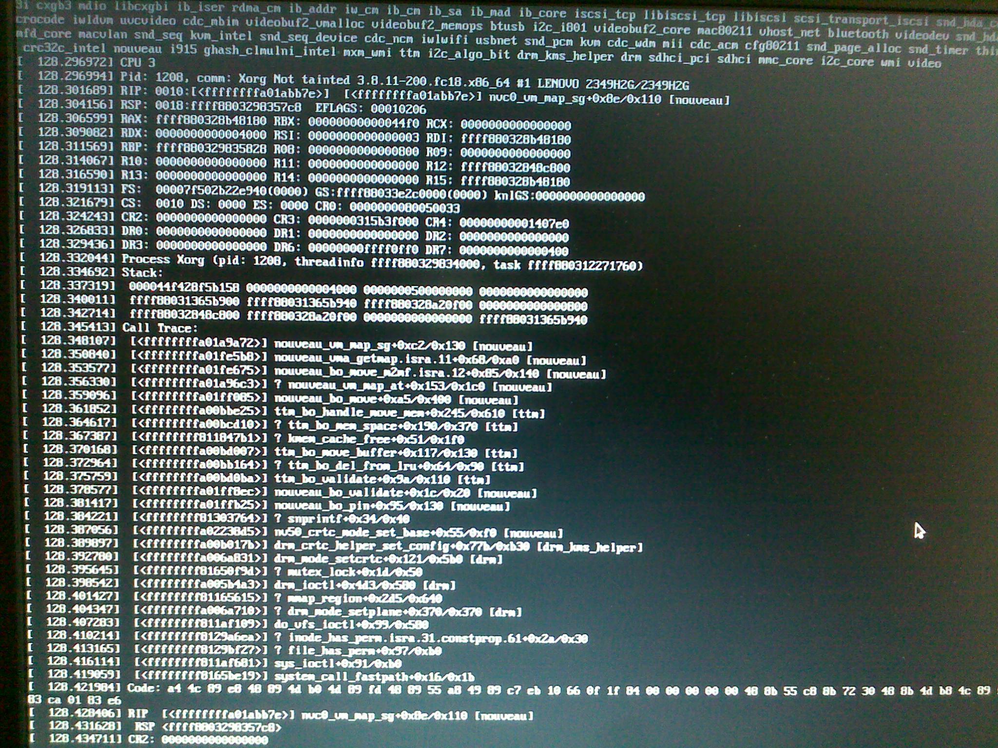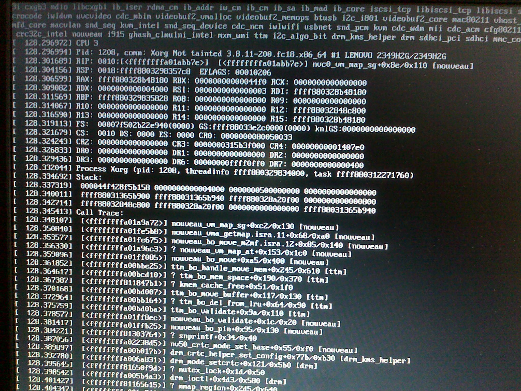 xrandr not working if booted with DVI cable connected doesn't seem to be the case *always*.. it's seems to be a bit random. one boot out of 10, or so, I'm able to see the nouveau connectors on xrandr, so I'm able to try to enable them, and thus hit the warn_on in the patch I added to the kernel. So here goes: [ 168.514913] ------------[ cut here ]------------ [ 168.514954] WARNING: at drivers/gpu/drm/nouveau/nouveau_bo.c:952 nouveau_vma_getmap.isra.11+0xc1/0xe0 [nouveau]() [ 168.514956] Hardware name: 2349H2G [ 168.514957] Modules linked in: fuse ebtable_nat ipt_MASQUERADE nf_conntrack_netbios_ns nf_conntrack_broadcast ip6 table_mangle ip6t_REJECT nf_conntrack_ipv6 nf_defrag_ipv6 iptable_nat nf_nat_ipv4 nf_nat iptable_mangle nf_conntrack _ipv4 nf_defrag_ipv4 xt_conntrack nf_conntrack be2iscsi iscsi_boot_sysfs bnx2i ebtable_filter cnic ebtables uio ip6t able_filter cxgb4i cxgb4 ip6_tables cxgb3i cxgb3 mdio libcxgbi ib_iser rdma_cm ib_addr iw_cm ib_cm ib_sa ib_mad ib_c ore iscsi_tcp libiscsi_tcp libiscsi scsi_transport_iscsi rfcomm bnep snd_hda_codec_realtek iTCO_wdt iTCO_vendor_support arc4 iwldvm acpi_cpufreq mac80211 mperf coretemp uvcvideo microcode snd_hda_intel videobuf2_vmalloc snd_hda_codec i2c_i801 videobuf2_memops snd_hwdep videobuf2_core snd_seq iwlwifi snd_seq_device videodev cdc_mbim btusb snd_pcm [ 168.514987] media bluetooth cfg80211 cdc_ncm usbnet cdc_wdm cdc_acm mii lpc_ich e1000e mfd_core snd_page_alloc snd_timer mei ptp thinkpad_acpi pps_core snd soundcore rfkill vhost_net tun macvtap macvlan kvm_intel kvm uinput dm_crypt crc32_pclmul crc32c_intel nouveau i915 ghash_clmulni_intel mxm_wmi sdhci_pci i2c_algo_bit sdhci ttm drm_kms_helper mmc_core drm i2c_core wmi video [ 168.515008] Pid: 914, comm: Xorg Not tainted 3.9.9-201.dbg01.fc18.x86_64 #1 [ 168.515009] Call Trace: [ 168.515017] [<ffffffff8105efc5>] warn_slowpath_common+0x75/0xa0 [ 168.515019] [<ffffffff8105f00a>] warn_slowpath_null+0x1a/0x20 [ 168.515036] [<ffffffffa020d801>] nouveau_vma_getmap.isra.11+0xc1/0xe0 [nouveau] [ 168.515046] [<ffffffffa019292a>] ? _nouveau_gpuobj_wr32+0x2a/0x30 [nouveau] [ 168.515062] [<ffffffffa020d8a6>] nouveau_bo_move_m2mf.isra.12+0x86/0x140 [nouveau] [ 168.515077] [<ffffffffa01b6b23>] ? nouveau_vm_map_at+0x153/0x1c0 [nouveau] [ 168.515092] [<ffffffffa020e2aa>] nouveau_bo_move+0x9a/0x400 [nouveau] [ 168.515100] [<ffffffffa007ee15>] ttm_bo_handle_move_mem+0x245/0x610 [ttm] [ 168.515106] [<ffffffffa007fd00>] ? ttm_bo_mem_space+0x180/0x360 [ttm] [ 168.515112] [<ffffffffa007fff7>] ttm_bo_move_buffer+0x117/0x130 [ttm] [ 168.515116] [<ffffffff8122b1fa>] ? ext4_dirty_inode+0x5a/0x70 [ 168.515125] [<ffffffffa00800aa>] ttm_bo_validate+0x9a/0x110 [ttm] [ 168.515140] [<ffffffffa020eb1c>] nouveau_bo_validate+0x1c/0x20 [nouveau] [ 168.515155] [<ffffffffa020ed4b>] nouveau_bo_pin+0x9b/0x100 [nouveau] [ 168.515158] [<ffffffff8130c6b4>] ? snprintf+0x34/0x40 [ 168.515173] [<ffffffffa0231b25>] nv50_crtc_mode_set_base+0x55/0xf0 [nouveau] [ 168.515180] [<ffffffffa007320b>] drm_crtc_helper_set_config+0x77b/0xb30 [drm_kms_helper] [ 168.515194] [<ffffffffa003c76e>] drm_mode_set_config_internal+0x2e/0x60 [drm] [ 168.515204] [<ffffffffa003eecc>] drm_mode_setcrtc+0x10c/0x570 [drm] [ 168.515208] [<ffffffff8165f88d>] ? mutex_lock+0x1d/0x50 [ 168.515217] [<ffffffffa002f483>] drm_ioctl+0x4d3/0x580 [drm] [ 168.515220] [<ffffffff81166dc5>] ? mmap_region+0x1c5/0x590 [ 168.515230] [<ffffffffa003edc0>] ? drm_mode_setplane+0x3b0/0x3b0 [drm] [ 168.515234] [<ffffffff811b1a97>] do_vfs_ioctl+0x97/0x580 [ 168.515238] [<ffffffff812a185a>] ? inode_has_perm.isra.32.constprop.62+0x2a/0x30 [ 168.515240] [<ffffffff812a2ee7>] ? file_has_perm+0x97/0xb0 [ 168.515243] [<ffffffff811b2011>] sys_ioctl+0x91/0xb0 [ 168.515247] [<ffffffff8166afd9>] system_call_fastpath+0x16/0x1b [ 168.515249] ---[ end trace 951f146548a30c98 ]--- I'll also attach the whole dmesg.