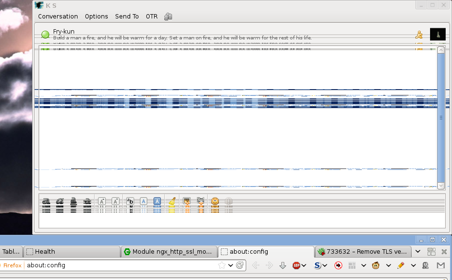 Created attachment 79630 [details] Corrupted window area in a Gtk+2 app (Pidgin), after a floating "hover notification" box has disappeared, the area under it is corrupted. Corrupted pixmaps (cached, I suppose) all around in Gtk+2 at least, and increasingly in Firefox (latest beta 22.0). Gtk+ corruptions seemed to appear after upgrading to latest GIT version of the Intel driver. Kernel upgrade from 3.8.13 -> 3.9.3 made no apparent difference. Occasional corruptions in Firefox have been around for quite a while (and reported separately), so that's probably another bug entirely. -- Window manager: WindowMaker 0.95.4 -- chipset: 00:02.0 VGA compatible controller: Intel Corporation 82G33/G31 Express Integrated Graphics Controller (rev 10) -- system architecture: i686 / 32bit -- xf86-video-intel: GIT abe85adda51c58d3f3b9c5dea6cec4b13a65cdcd -- xserver: X.Org X Server 1.12.4-6 from latest Debian testing -- mesa: 8.0.5-4 from Debian testing -- libpixman: 0.26.0-4 -- libdrm version: 2.4.40-1 -- kernel version: 3.9.3 (vanilla from kernel.org) -- Linux distribution: current Debian Testing -- Machine or mobo model: Asus P5KPL-CM -- Display connector: VGA