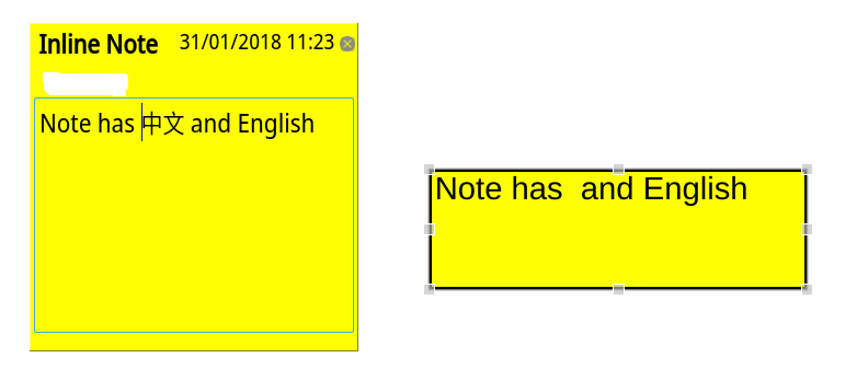 Created attachment 137093 [details] Okular inline note with Chinese and English characters In addition to Vdragon's attachment in Comment #13, I'd like to add a more intuitive example here with mixed Latin and Chinese characters. The shown characters are "Note has 中文 and English". Obviously, "中文" appears in the editor but not in the inline note.