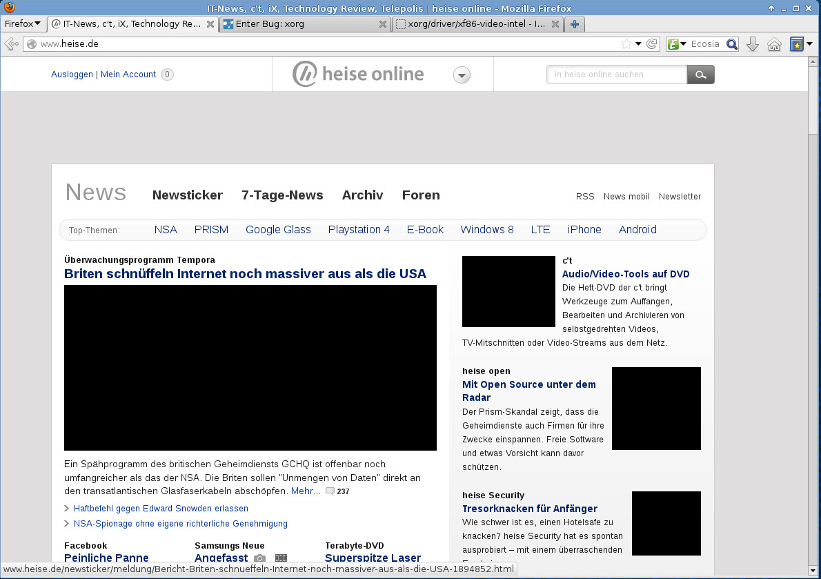 Created attachment 81233 [details] screenshot of firefox I've just tried 2.21.10 on my SandyBridge-Notebook and there seem to be a few things off: - Many images in firefox are simply rendered black - Scrolling in some documents results in white area with AcroRead (that proprietary thing - as evince devs really tried hard to make evince as ugly as possible)