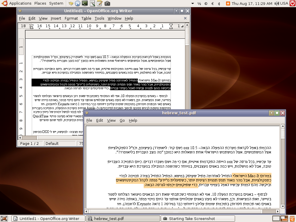 Created attachment 82000 [details] PDF Test case I am reporting to poppler-glib, though it might be a general issue on how PDF with RTL scripts are handled in poppler. As per reported in GNOME Bugzilla: "When I try to select text written in an RTL script (Hebrew, in my case) the selection algorithm treats it like LTR text. This means that if I start a selection in the midlle of a line in an RTL paragraph and move the cursor to the middle of the next line, the selection spans to the right on the first line and from the left up to the cursor in the next line. This is okay for LTR, but in RTL scripts it should work exactly the opposite. The expected behaviour is just like the GtkTextView widget's." I tested it also with poppler-glib-demo. It is reproducible when selecting multiples lines. One of the comments has a clue of the problem: https://bugzilla.gnome.org/show_bug.cgi?id=326083#c5 "PDF stores Hebrew internally as visual Hebrew (LTR), so Envice will have to detect Hebrew text and work around this. It seems like Envice Evince 0.5.2 Using poppler 0.5.1 (splash) correctly reverses Hebrew when pasting to gedit, but does not do the selection properly (like Yaron noted)."