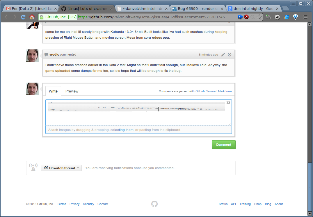 I've made quite a few minor fixes, none of which ostensibly look like it should fix this issue, but double checking with the current rc kernel (3.12-rc2) and latest xf86-video-intel.git is a must. Afterwards, you can try enabling (independently, and/or in combination) #define DBG_NO_UPLOAD_CACHE #define DBG_NO_UPLOAD_ACTIVE #define DBG_NO_MAP_UPLOAD in src/sna/kgem.c and see if any of those prevent the corruption.