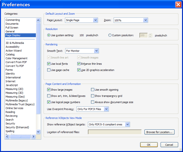 I've attached a screenshot of the Adobe Acrobat page display settings. You're right, Adobe does differently depending on these settings! I've always had the "2D graphics acceleration" setting on. With it on, the rendering proceeds as it should (in my opinion; more on that later): smoothing the image for non-integer scaling factors and rendering bitonal for integer scaling factors. However, if I uncheck that box then I get an option to set "Smooth images". Amazingly, this option controls smoothing for ALL scaling factors at once: with it on you always get smoothing (even for 1-to-1 scale), and with it off you never get smoothing. It's amazing, but true: my graphics card driver does better job scaling images than does Adobe ) Another example of a piece of software that proceed in the (partly) correct fashion (in my opinion) about this is WinDjView - smoothing for all scales except scale=1. Another piece of (somewhat irrelevant) information about PDF: there's the so-called "interpolate" flag for each JPEG image in the PDF that should tell any (respecting) PDF render to interpolate images for scales > 1 (i.e., if a PDF page containing a 300dpi image is shown at 600% magnification; screen resolution of 100dpi is again assumed). This flag has no effect on how the image is encoded, only on how it should be rendered. It's rarely used by PDF producers, however. This has no direct relevance to the question we're discussing. Just wanted to mention in case someone finds it curious. I would like to outline the reasons for not smoothing images at integer scale factors next. Since I was only given a choice to either close this ticket or move it to a feature request, and since closing it means I can't write along these lines any further I'd have to agree to moving it to a feature request. Shall I open a feature request or you can move this stuff over there somehow?