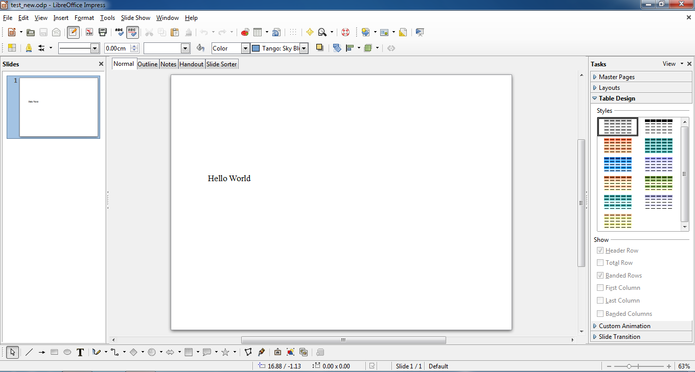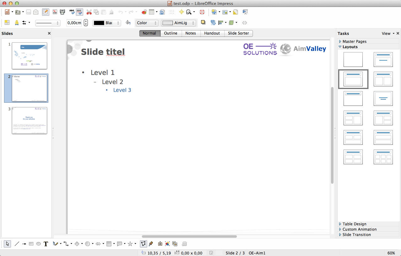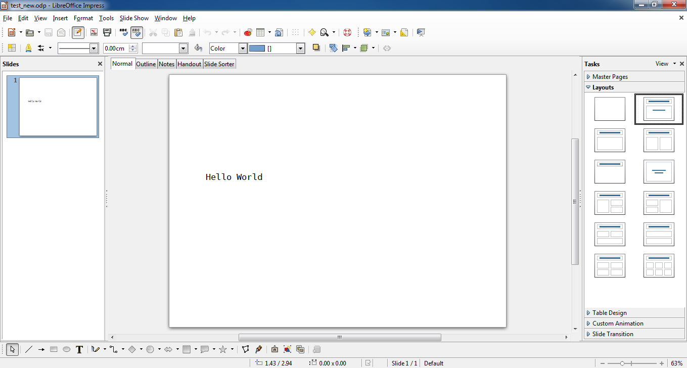 Created attachment 84583 [details] screenshot of test.odp in LO4.1.1.2 on OSX 10.8.4 Screenshot of test.odp in LO4.1.1.2 on MacOS. On Win 8 with LO4.1.1.1 I was getting the same result. It may have something to do with whether or not the template on which this presentation is based is installed.