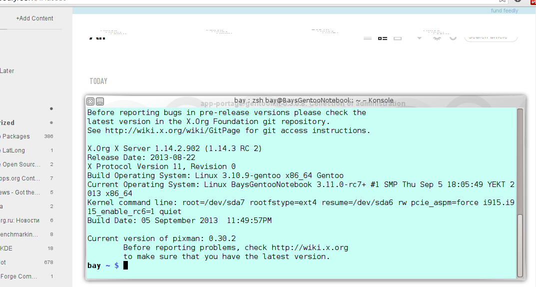 Created attachment 85278 [details] The corruption and X -version This is a part of X -version output: X.Org X Server 1.14.2.902 (1.14.3 RC 2) Release Date: 2013-08-22 X Protocol Version 11, Revision 0 Build Operating System: Linux 3.10.9-gentoo x86_64 Gentoo Current Operating System: Linux BaysGentooNotebook 3.11.0-rc7+ #1 SMP Thu Sep 5 18:05:49 YEKT 2013 x86_64 After I recompiled the xorg-server on 3.11.0-rc7+ I can't reproduce the bug. I've tested with several video driver versions and never saw the corruption. Then I returned to 3.10.9 kernel and recompiled xorg-server once again and bug reapeared. After this I recompiled xorg-server on 3.11.0-rc7+ once more again and bug disappeared again. It's a bit odd. Can X server behavior depend on version of kernel on compilation time?