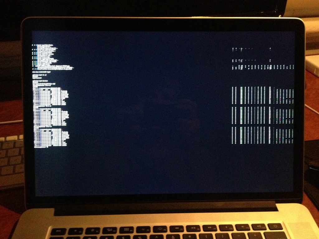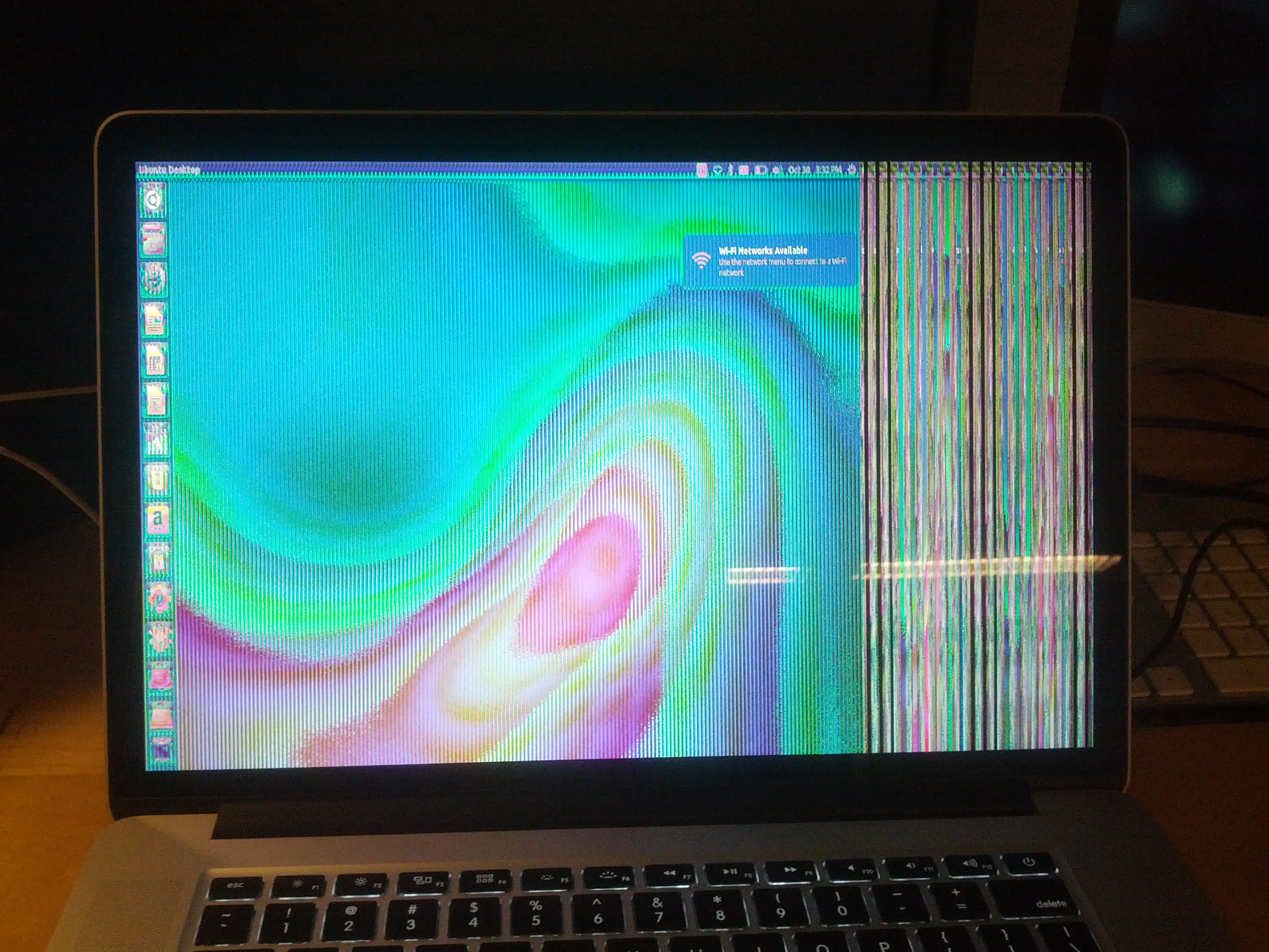 Created attachment 88363 [details] photo describing the error I'm experiencing a corrupted display on my retina MBP, late 2013, intel-only model. There are greenish vertical lines and also thicker black ones on the right-hand side of the screen. Photo is attached, I'll be attaching also necessary files for debugging. I am using Ubuntu 13.10, mesa 9.2.1, Xorg 1.14.3 + the latest xorg/driver/xf86-video-intel from git, kernel 3.12rc7.