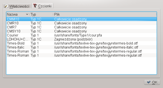 Created attachment 91503 [details] a screenshot of okular -> file -> properties -> fonts Note that the selected substitution font face Tex Gyre Termes does have the ligatures in place (although I do not know which font is used to typeset the fragment with blanked ligatures).