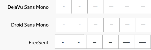 Created attachment 91958 [details] Comparison of DejaVu Sans Mono, Droid Sans Mono & FreeSerif dashes. For some reason, in DejaVu Sans Mono, the em dash (U+2014) and the en dash (U+2014) have the same width -- the maximum character width of DejaVu. They are also not as wide as the "m" or "n" characters, respectively. Other monospace fonts solve this better, such as e.g. Source Code Pro or Droid Sans Mono. (The included FreeSerif comparison is a bit of an accident, but maybe shows how a "normal" behaves.)