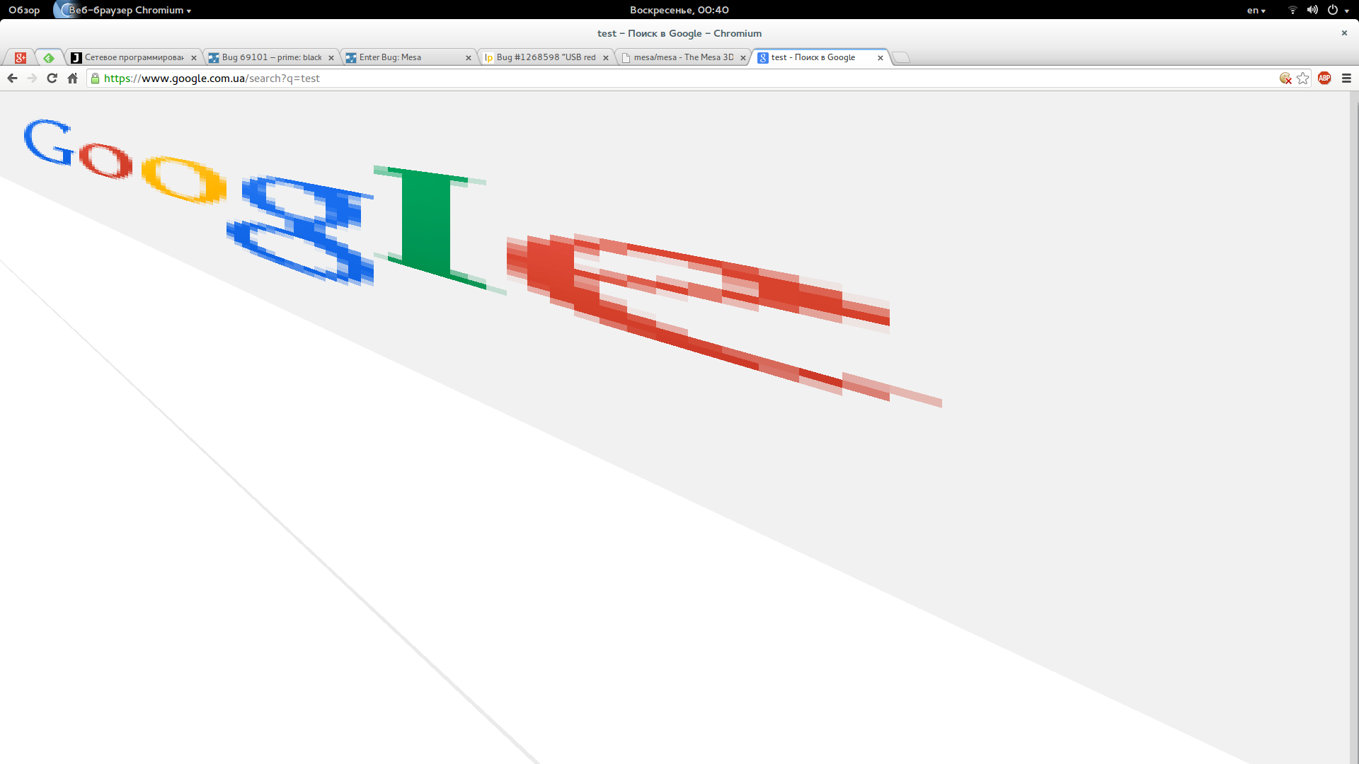 Created attachment 92788 [details] Screenshot of https://www.google.com.ua/search?q=test Some commit few days ago broke page rendering in chrome/chromium on intel videocards. I can't say what exactly commit it were, but it were somewhere in between ff59b3 and 6ec210. Tested on Ubuntu 13.10, Chromium 32/Chrome 32, Mesa from ppa:oibaf/graphics-drivers, Intel HD Graphics 2500.