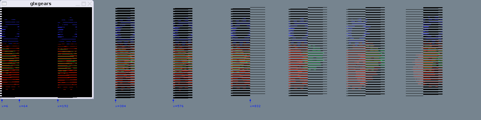 I am having display corruption when using (any) OpenGL application with hardware rendering on a Radeon 9250 card and an AMD64 CPU. Somehow, horizontal lines of 64 pixels get scattered accross the screen, instead of placed in columns neatly side by side. In glxgears, the first (64-border_width) pixels are in the right place. The next 128 pixels to the right are not drawn. Then there are 64 more pixels that belong under the first 64. Another 128 undrawn pixels and then there are more drawn. For your convenience and enjoyment I have captured an image that shows the top 400 pixels of a 1600x1200 screen with glxgears running. This problem occurs only when running the x86_64 kernel, the system is fine with the i386 kernel. This issue is not a (recent) regression but has been present in all recent versions of xorg+kernels that I have tried.
