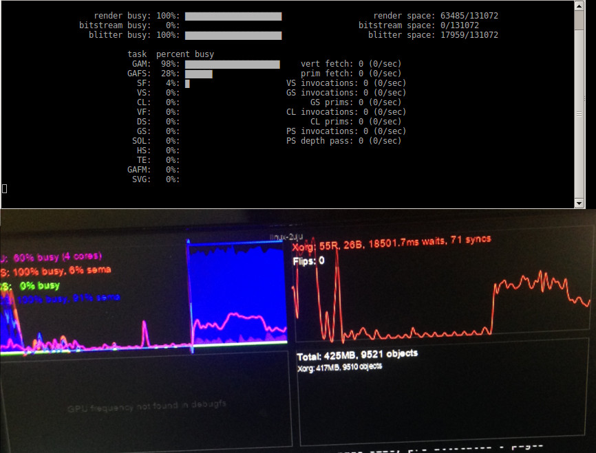 Hmm. [ 253.551569] Xorg D ffff88021fa13800 0 1348 1302 0x00400004 [ 253.551571] ffff880036459a68 0000000000000082 ffff8802143d2050 ffff880036459fd8 [ 253.551572] 0000000000013800 0000000000013800 ffff8802143d2050 ffff88021fa140b8 [ 253.551573] ffff88021165c000 0000000000000001 0000000000000000 ffff8802143d2050 [ 253.551575] Call Trace: [ 253.551577] [<ffffffff815cdfb8>] io_schedule+0x98/0x130 [ 253.551589] [<ffffffffa0117915>] __wait_seqno+0x315/0x580 [i915] [ 253.551606] [<ffffffffa0118a6a>] i915_gem_object_wait_rendering+0x3a/0x70 [i915] [ 253.551622] [<ffffffffa0118f3b>] i915_gem_object_finish_gpu.part.50+0xb/0x20 [i915] [ 253.551638] [<ffffffffa011bef8>] i915_vma_unbind+0x1d8/0x2b0 [i915] [ 253.551657] [<ffffffffa011ca5f>] i915_gem_object_pin+0x17f/0x750 [i915] [ 253.551676] [<ffffffffa011d917>] i915_gem_object_pin_to_display_plane+0xc7/0x190 [i915] [ 253.551696] [<ffffffffa013608f>] intel_pin_and_fence_fb_obj+0x9f/0x140 [i915] [ 253.551726] [<ffffffffa013617f>] intel_gen7_queue_flip+0x4f/0x300 [i915] [ 253.551756] [<ffffffffa013e819>] intel_crtc_page_flip+0x1d9/0x3c0 [i915] [ 253.551789] [<ffffffffa0096bde>] drm_mode_page_flip_ioctl+0x15e/0x2d0 [drm] [ 253.551807] [<ffffffffa008696d>] drm_ioctl+0x46d/0x570 [drm] [ 253.551811] [<ffffffff811a23f7>] do_vfs_ioctl+0x2d7/0x4b0 [ 253.551817] [<ffffffff811a2650>] SyS_ioctl+0x80/0xa0 [ 253.551820] [<ffffffff815d807d>] system_call_fastpath+0x1a/0x1f [ 253.551822] [<00007fe5cdca91e7>] 0x7fe5cdca91e6 [ 257.990590] Xorg D ffff88021fa13800 0 1348 1302 0x00400004 [ 257.990591] ffff880036459a68 0000000000000082 ffff8802143d2050 ffff880036459fd8 [ 257.990593] 0000000000013800 0000000000013800 ffff8802143d2050 ffff88021fa140b8 [ 257.990594] ffff88021165c000 0000000000000001 0000000000000000 ffff8802143d2050 [ 257.990596] Call Trace: [ 257.990598] [<ffffffff815cdfb8>] io_schedule+0x98/0x130 [ 257.990614] [<ffffffffa0117915>] __wait_seqno+0x315/0x580 [i915] [ 257.990634] [<ffffffffa0118a6a>] i915_gem_object_wait_rendering+0x3a/0x70 [i915] [ 257.990652] [<ffffffffa0118f3b>] i915_gem_object_finish_gpu.part.50+0xb/0x20 [i915] [ 257.990671] [<ffffffffa011bef8>] i915_vma_unbind+0x1d8/0x2b0 [i915] [ 257.990693] [<ffffffffa011ca5f>] i915_gem_object_pin+0x17f/0x750 [i915] [ 257.990712] [<ffffffffa011d917>] i915_gem_object_pin_to_display_plane+0xc7/0x190 [i915] [ 257.990735] [<ffffffffa013608f>] intel_pin_and_fence_fb_obj+0x9f/0x140 [i915] [ 257.990767] [<ffffffffa013617f>] intel_gen7_queue_flip+0x4f/0x300 [i915] [ 257.990802] [<ffffffffa013e819>] intel_crtc_page_flip+0x1d9/0x3c0 [i915] [ 257.990836] [<ffffffffa0096bde>] drm_mode_page_flip_ioctl+0x15e/0x2d0 [drm] [ 257.990859] [<ffffffffa008696d>] drm_ioctl+0x46d/0x570 [drm] [ 257.990864] [<ffffffff811a23f7>] do_vfs_ioctl+0x2d7/0x4b0 [ 257.990870] [<ffffffff811a2650>] SyS_ioctl+0x80/0xa0 [ 257.990872] [<ffffffff815d807d>] system_call_fastpath+0x1a/0x1f [ 257.990875] [<00007fe5cdca91e7>] 0x7fe5cdca91e6