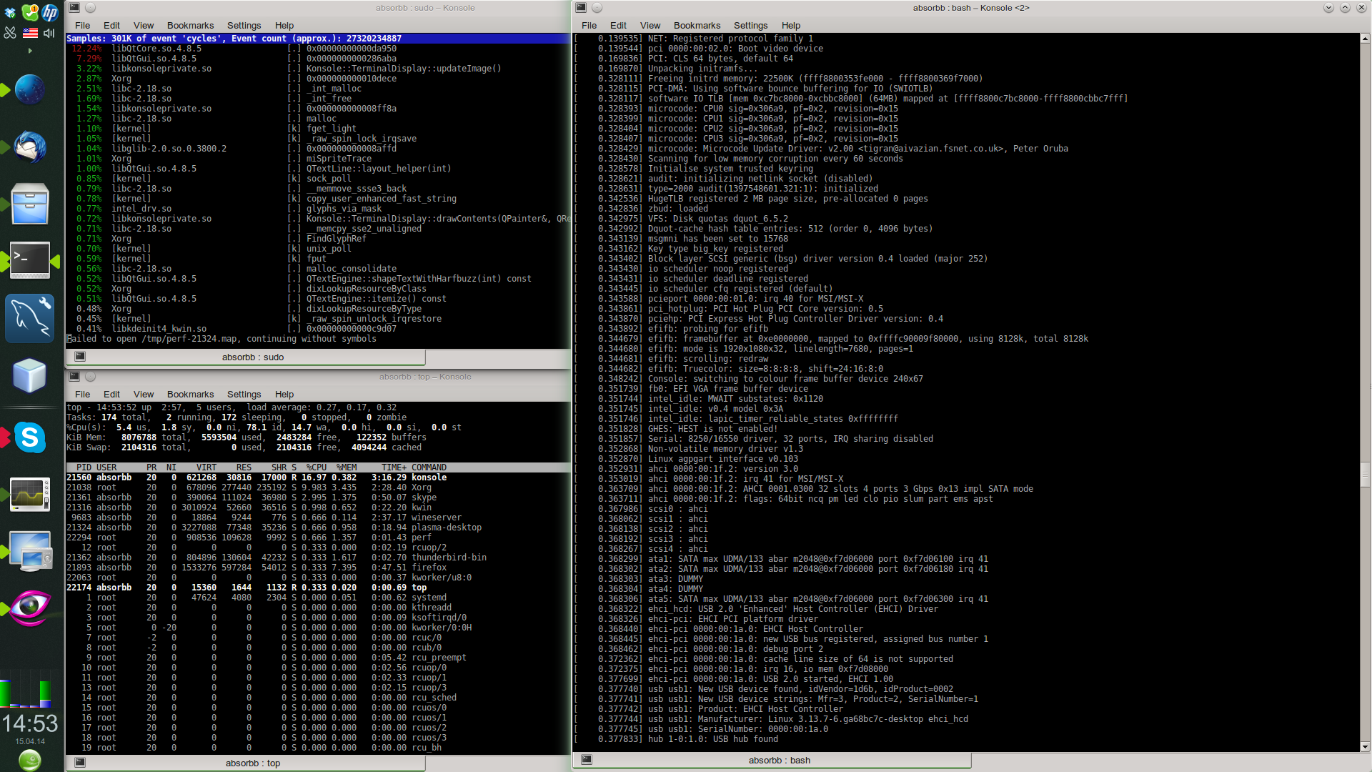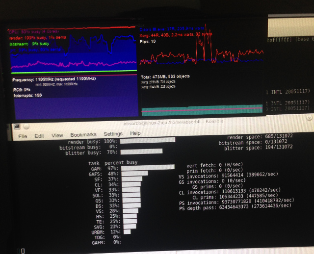 Here we are: [ 852.533] slow read access to linear bo with pitch 5464 (handle=697, size=1642496), scanout? 0, io? 0 [ 852.551] slow read access to linear bo with pitch 5464 (handle=697, size=1642496), scanout? 0, io? 0 [ 852.567] slow read access to linear bo with pitch 5464 (handle=697, size=1642496), scanout? 0, io? 0 The thing is these messages never appear when i scroll in Konsole - that is why i didnt see them. Running OpenSuSE YaST triggers them, but it works fine.