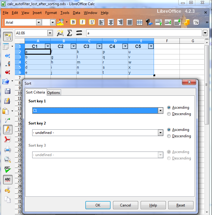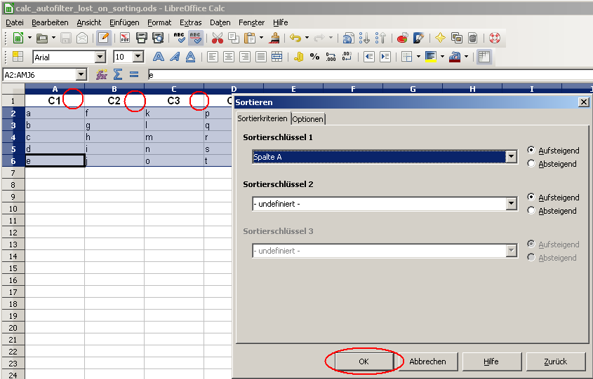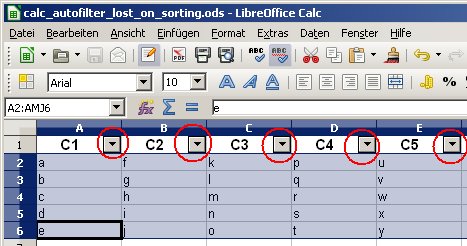 Created attachment 97389 [details] The example document. After sorting some lines in a spreadsheet which has a autofilter set, the autofilter gets lost. The expected behaviour is, that sorting lines should *not* affect the autofilters. Steps to reproduce: 1. Open the attached document with a set of data and a autofilter applied on the captions. 2. Select some (or all) of the example data records. 3. Select "Data" -> "Sort..." on the menu. 4. The autofilter arrows already disappear when the sorting-options-dialog is opened. If you now click "OK", the filters are lost. If you click "Cancel" the autofilters re-appear. (see screenshots attached) Tested with LO 3.4.5, 4.2.2 and 4.3.3 on Windows XP, Server 2003 and Windows 7 with always the same behaviour.