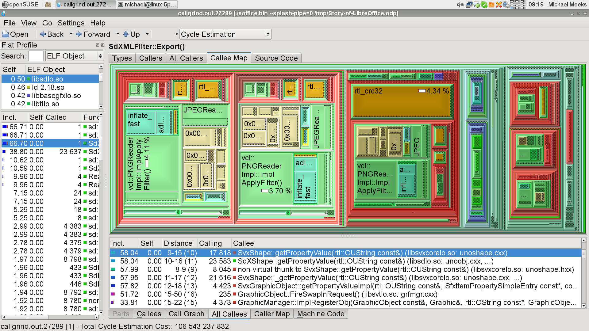 It takes me a very long time to save my 88 slide deck (much longer than to load it) - you can load it as hybrid PDF here: http://people.gnome.org/~michael/data/2014-04-26-story-of-libreoffice.pdf Profiling it in callgrind overnight (yes it takes that long ;-) it turns out that ~all of that time is consumed -loading- and de-compressing the images - there is ~zero cost for exporting them (so I can only think that the binary data is copied directly across to the new container - which is good). That is really silly =) and (perhaps) another example of the really unfortunate image handling design we have [ though it could just be a silly bug I guess ].