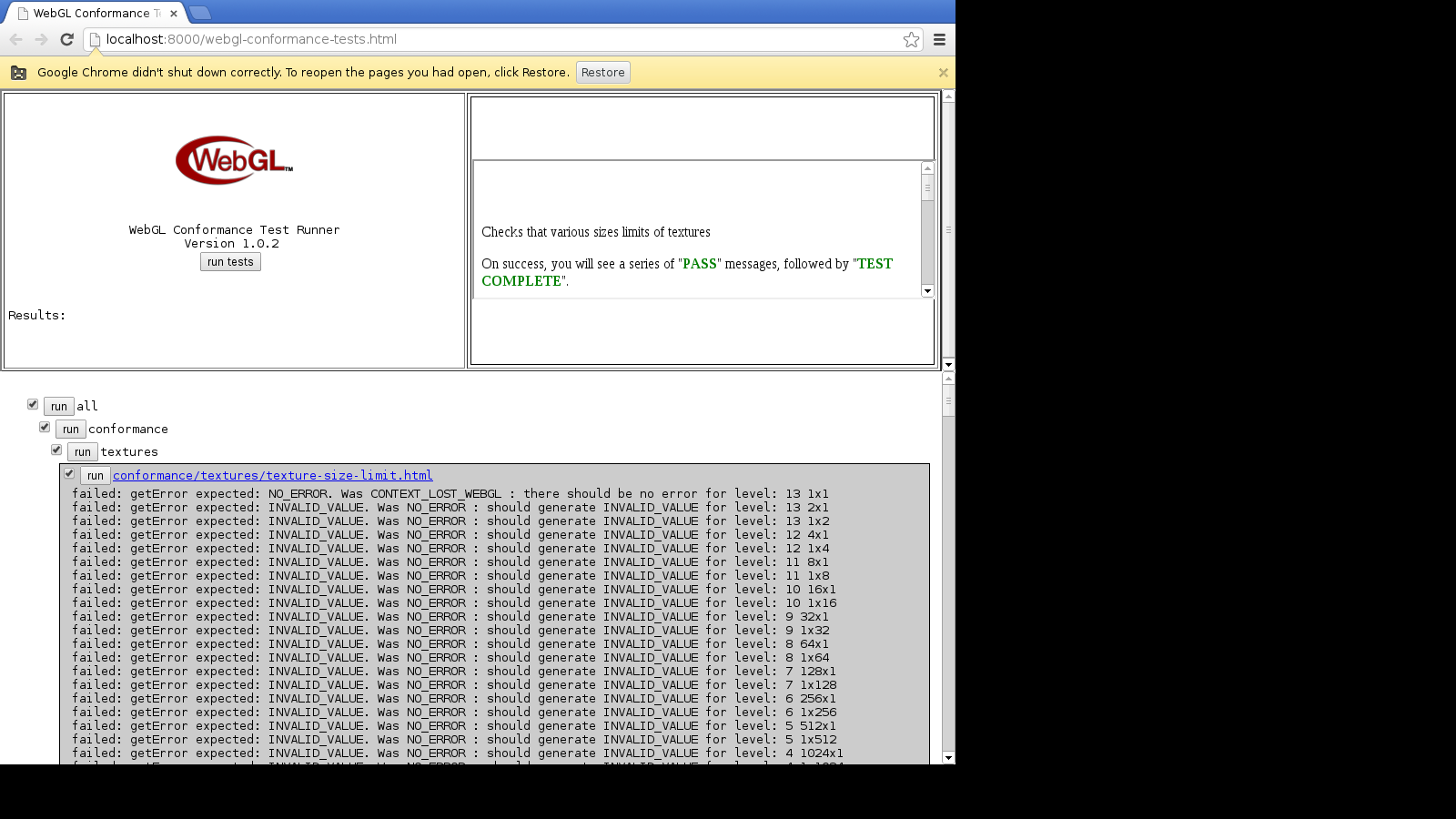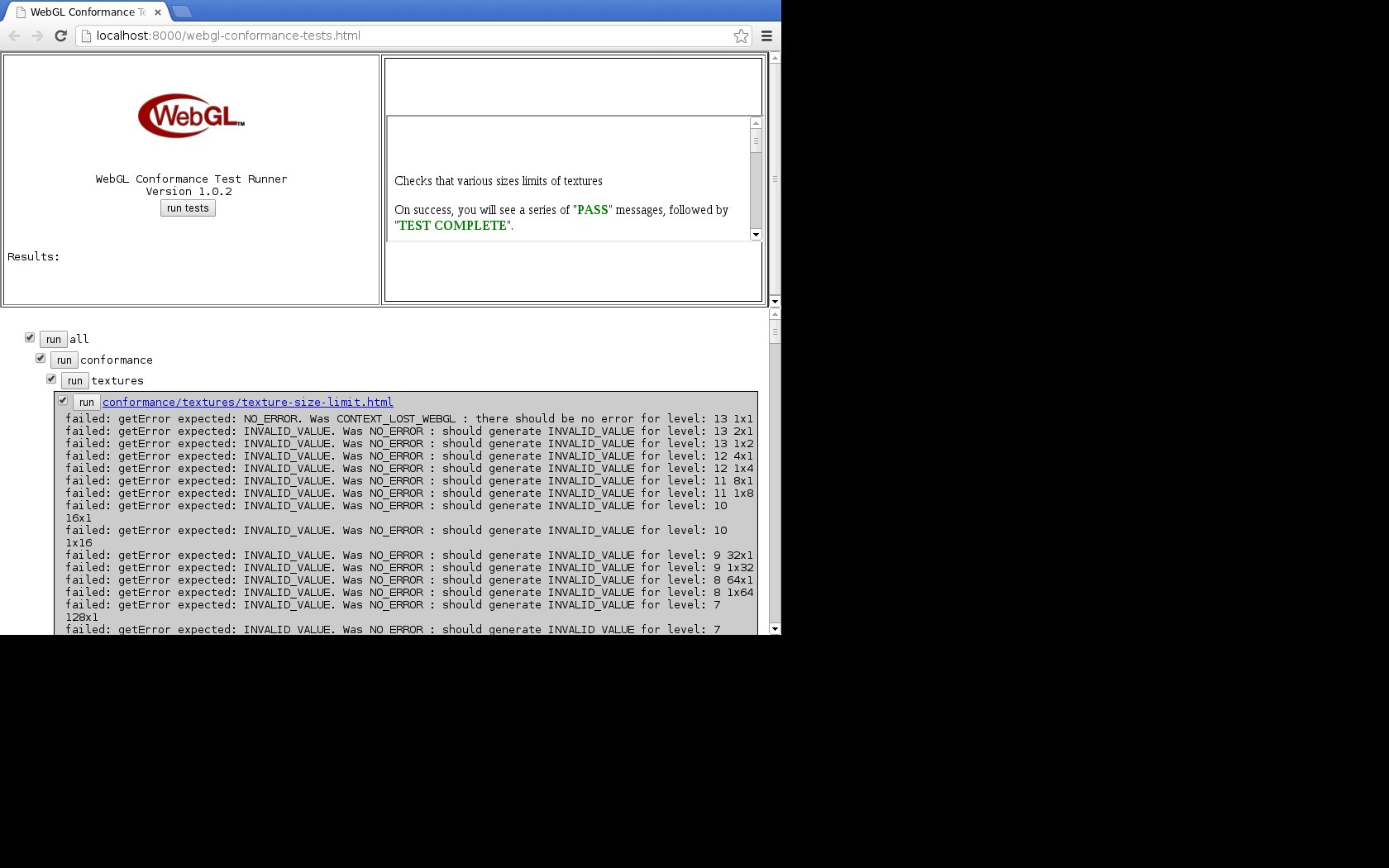 Lu Hua, from your test output it looks like the context is lost before the conformance suite ever reaches the texture-size-limit test. Though, the I am looking at a screenshot of a webpage, so maybe I'm interpreting it incorrectly. Also, my patch affects only 64-bit systems. You're running on a 32-bit system.