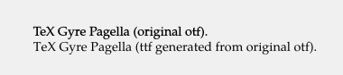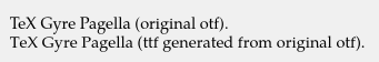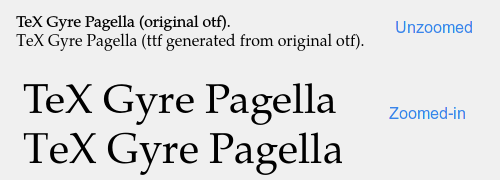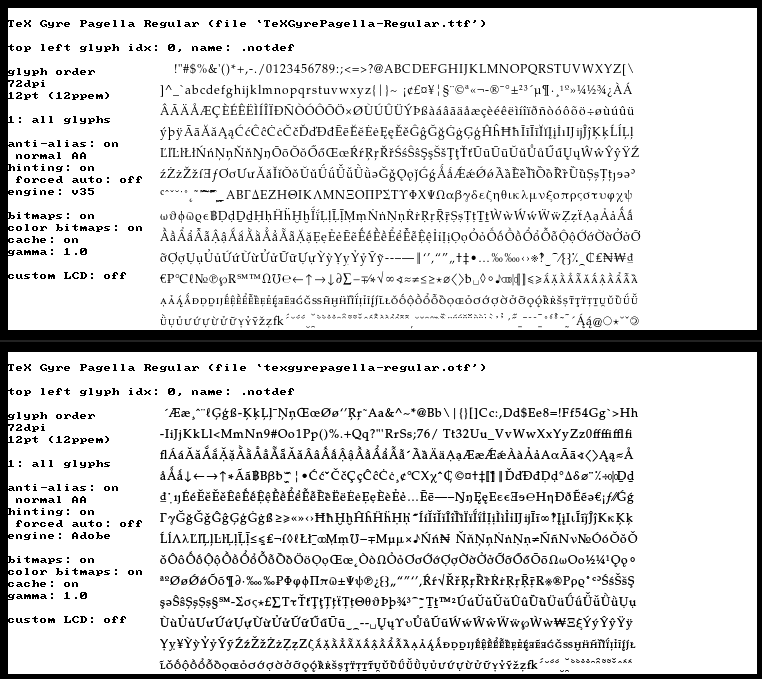 > There is no such thing as identical hinting between CFF and glyf fonts. Point taken. I'll rephrase to: They should render similarly enough so it doesn't appear as if one is black and the other regular at low zoom if they render identically when zommed in. > How did you generate the instructions for the glyf (aka ttf)? Fontforge? > Ttfautohint? By hand? I've tried: - straight otf->ttf via fontforge - running ttfauthint on the ttf - converting the results of ttfauthint back into otf via fontforge - running authint from the adobe FDK on the otf. and comapring against each other. It gets a little tricky (XeLatex and fontconfig have a will of their own) but so far the rendering is consistently different between otf and ttf, and so far it's by far the dominating factor in the appearence of the rendered page. > I see that the metrics are different. Did you lose kerning? You probably meant the faulty pdf. The answer is still: possibly, I didn't check (I'm a fontforge novice). Though kerning can affect color the difference in visual appearence looks to me as being on the level of individual glyphs. Since the difference disappears when zooming in, I took that as a hint (pardon) that the issue has to do with hinting, but perhaps it's something else I'm unaware of. The "mistaken" screenshot is actually quite close to the weight difference I'm seeing, even with the wrong fonts (still otf vs. ttf rendering). >I expect a pdf viewer to disable all hinting for the rendered page. >AFAIK evince follows that philosophy. But if not, freetype added a new >hinting engine in that last year, contributed by Adobe, which darkens >glyphs at low resolutions. Perhaps that explains what you see? Using okular, I've disabled hinting (which does make a slight visual difference) but the prononounced effect I described remains. otf is black ttf is regular. Wouldn't you expect it to act similarly on both fonts? it's really not a subtle visual difference I'm seeing. > Or, the difference between how cubic and quadratic splines render might > be noticible at those p/ex sizes. You got me there. You're refering to a difference in how the glyph curves are represented in each font format? Doesn't the fact that acrobat reader doesn't have this issue suggest otherwise? Is there a way to tell if it's patented magic on behalf of adobe or a bug in poppler's rendering (or somewhere else in the stack)? I'm attached a new screenshot of the appearence of the pdf zoomed out and close up taken from okular. evince looks much the same.