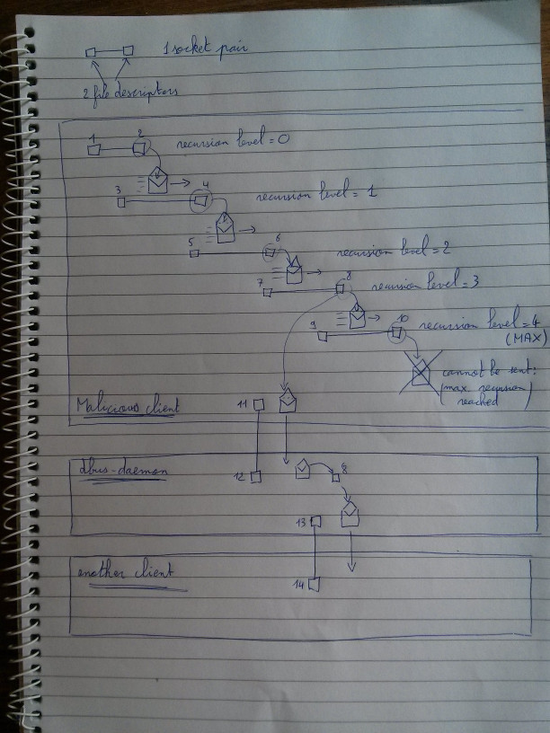 Created attachment 101289 [details] dbus-dos-recursive-fdpass.jpg (In reply to comment #1) > I'm not sure I understand what the problem is. Is someone trying to pass the > file descriptor of the D-Bus connection itself? No, fds of D-Bus connections are not passed around. I am attaching a schema to show this. The malicious program creates 5 socket pairs with socketpair(2): (fd1, fd2), (fd3, fd4), (fd5, fd6), (fd7, fd8), (fd9, fd10) The kernel initializes all unix_sk(sk)->recursion_level to 0. And it passes fds around in this way: - A packet containing fd2 is sent through fd3 to reach fd4's delivery queue (fd4's recursion level is 1) - A packet containing fd4 is sent through fd5 to reach fd6's delivery queue (fd6's recursion level is 2) - A packet containing fd6 is sent through fd7 to reach fd8's delivery queue (fd8's recursion level is 3) - A packet containing fd8 is sent through fd9 to reach fd10's delivery queue (fd10's recursion level is MAX_RECURSION_LEVEL=4 so it cannot be passed) So far, D-Bus socket fd11 was not involved. Then: - A D-Bus message containing fd8 is sent through D-Bus socket fd11 to reach fd12's delivery queue in the dbus-daemon process. - dbus-daemon receives the message and fd8. fd8's recursion level is still 3, so it could forward it to another D-Bus client. Unfortunately, fd8's recursion level can change at any time, because the malicious program still has a copy of fd8. - The malicious program now sends a packet containing fd8 through fd7 to reach fd8's delivery queue. fd8's recursion level is now MAX_RECURSION_LEVEL=4 and fd8 cannot be passed anymore. - dbus-daemon is scheduled and tries to forward the D-Bus message containing fd8 through fd13 for another client. It fails with ETOOMANYREFS. - dbus-daemon close(fd13) - another_client is notified on fd14 that the D-Bus connection is shutdown and it terminates. The malicious program managed to kill another_client in this way.