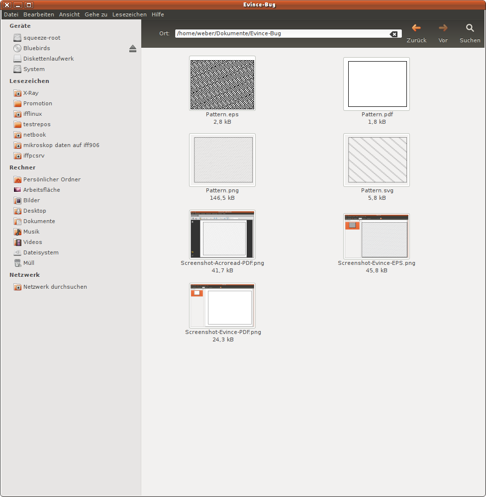 Created attachment 101406 [details] SVG source file Originally reported at https://bugs.launchpad.net/ubuntu/+source/evince/+bug/1087712 The fill pattern is created with Inkscape and then exported as PDF (source file, and PDF, EPS and PNG export appended). Observed behavior: Acrobat Reader and Okular render the fill pattern correctly from the PDF. In Evince and in the Nautilus preview, the fill pattern does not appear in the PDF. The fill pattern is rendered correctly from an EPS (Screenshots attached). Expected behavior: The file and preview look the same in all viewers. In particular, the pattern is displayed correctly in Evince and Nautilus.