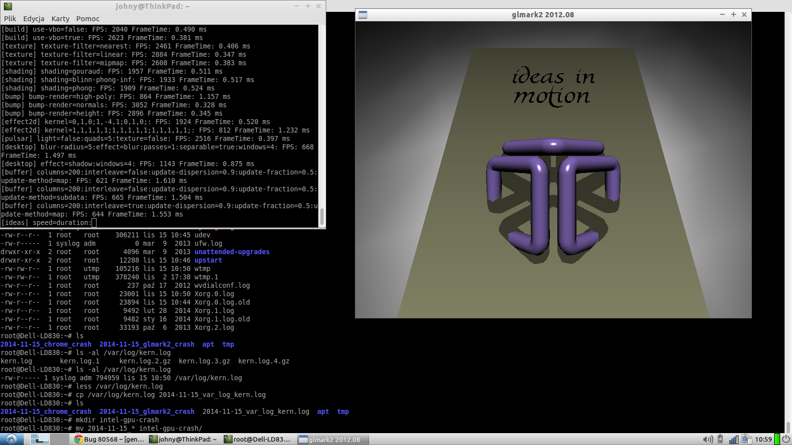 Hello, I have tried to found first version of kernel / intel drivers / chroem drivers which was cousing problems from apt-get logs: root@Dell-LD830:~# grep -i Start-Date apt/* | perl -n -e 'BEGIN{my %hn;} $hn{$1}->{$2} = 1 if m/(\w+\.?\w*\.?\w*\.?\w*):.*?:\s+(\d+-\d+-\d+)/imgs; END{ print $_.": ".join(", ", sort keys %{$hn{$_}})."\n" for (sort(keys %hn)); }' history.log: 2014-11-02, 2014-11-11 history.log.1: 2014-10-02, 2014-10-13, 2014-10-16, 2014-10-20 history.log.10: 2014-01-06, 2014-01-16 history.log.11: 2013-12-01, 2013-12-04, 2013-12-08, 2013-12-18, 2013-12-27, 2013-12-30 history.log.12: 2013-11-17, 2013-11-24 history.log.2: 2014-09-09, 2014-09-21, 2014-09-26 history.log.3: 2014-08-24 history.log.4: 2014-07-03, 2014-07-19 history.log.5: 2014-06-08 history.log.6: 2014-05-28 history.log.7: 2014-04-15 history.log.8: 2014-03-01, 2014-03-05, 2014-03-09, 2014-03-11, 2014-03-16 history.log.9: 2014-02-06, 2014-02-10, 2014-02-22 The GPU-Hung bug first occured about 2 weeks beforei've reported it here. So I should check versions before 2014-06-12. Probably bug was introduced in one of this upgrades: history.log.5: 2014-06-08 history.log.6: 2014-05-28 Here are version that i was using at that time (extracted from logs): From history.log.9: Start-Date: 2014-02-06 19:28:45 Commandline: apt-get upgrade ... linux-image-3.11.0-15-generic:i386 (3.11.0-15.23, 3.11.0-15.25) linux-firmware:i386 (1.116, 1.116.1) xserver-xorg-video-intel:i386 (2.99.904-0ubuntu2, 2.99.904-0ubuntu2.1) flashplugin-installer:i386 (11.2.202.335ubuntu0.13.10.1, 11.2.202.336ubuntu0.13.10.1) ... From history.log.7: Start-Date: 2014-04-15 16:41:31 Commandline: apt-get upgrade ... google-chrome-stable:i386 (33.0.1750.152-1, 34.0.1847.116-1) ... From history.log.6: Start-Date: 2014-05-28 21:05:02 Commandline: apt-get upgrade ... linux-firmware:i386 (1.127, 1.127.2) linux-image-extra-3.13.0-24-generic:i386 (3.13.0-24.46, 3.13.0-24.47) linux-libc-dev:i386 (3.13.0-24.46, 3.13.0-27.50) linux-headers-3.13.0-24:i386 (3.13.0-24.46, 3.13.0-24.47) linux-headers-3.13.0-24-generic:i386 (3.13.0-24.46, 3.13.0-24.47) linux-image-3.13.0-24-generic:i386 (3.13.0-24.46, 3.13.0-24.47) ... From history.log.5: Start-Date: 2014-06-08 20:15:24 Commandline: apt-get upgrade ... libegl1-mesa:i386 (10.1.0-4ubuntu5, 10.1.3-0ubuntu0.1) libosmesa6:i386 (10.1.0-4ubuntu5, 10.1.3-0ubuntu0.1) libegl1-mesa-drivers:i386 (10.1.0-4ubuntu5, 10.1.3-0ubuntu0.1) libwayland-egl1-mesa:i386 (10.1.0-4ubuntu5, 10.1.3-0ubuntu0.1) ... For further reference I will include whole apt-get history as zip file.