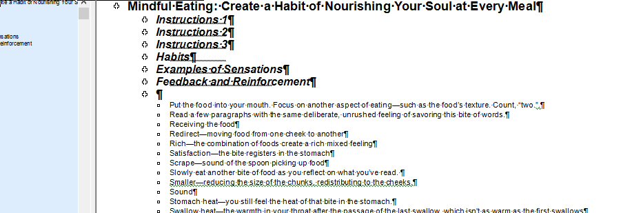 Problem description: I've been writing to you guys since Open Office was first released, because I need a feature that is entirely required for my work. At the beginning, I didn't feel comfortable about Bugzilla, so I wrote to OpenOffice through the website or comments--I don't remember what. When I posted recently, it was marked as a duplicate and I found some of the other people who also need this feature. The feature is LIBRE OFFICE WRITER IS UNUSABLE BY ME AS A PROFESSIONAL WRITER UNTIL IT HAS A FULLY FUNCTIONAL OUTLINER. Steps to reproduce: 1. Open Microsoft Word. Open any document which has headers and paragraphs. A large document with Headers 1, 2, and 3 would do very well. 2. Click: View>Outliner. 3. In the "Show Outline Level" drop-down box on the Outlining Toolbar, click "Show Level 1." 4. Notice the button icons in front of all of the Header 1 titles that show up on the screen. 5. Click one of these button icons using your left mouse button. 6. Hold the mouse button down and drag that header to a new location by moving it up or down in the document. 7. In the "Show Outline Level" drop-down box, click "Show Level 2." 8. Notice the hierarchy of titles that appears on the screen. Notice that it looks like the Navigator in LO, and that the Level 2 titles are indented. 9. Within each one of the sections of the document, use the method in step #6 to rearrange the subsections. In other words, click and drag subsections to new locations anywhere in the section or in the document. 10. Repeat this entire process with Level 3. 11. In the "Show Outline Level" drop-down box, click "Show All Levels." 12. Notice that all paragraphs are now showing. 13. Click the button on the Outline toolbar that has a tool tip that says, "Show First Line Only." This may be by default to the right of the "Show Outline Level" drop-down box. 14. Notice that now only one line shows from every paragraph. Notice how this unclutters the screen. 15. Within each one of these base sections of the document, use the method in step #6 to rearrange the paragraphs. In other words, click and drag paragraphs to new locations anywhere in the section or in the document. 16. Try using this system to organize a to-do list, an organization list from any organization, a brainstorm list, notes from a technical meeting, etc. 17. Do this by creating Level 3 headers. Drag notes from the raw brainstorm list into the headers. When necessary, collapse individual headers to keep the screen neat and tidy. 18. When your raw list is completely organized, collapse all header 3s so that only the header 3s show. Paragraphs no longer show at all. This looks just like the Navigator in LO. 19 Create Header 2s. Organize all of the Header 3s into Header 2s. 20. Repeat this process to organize all of the Header 2s into Header 1s. 21. Click "Show All Levels." 22. Change the view to Print or Normal. 23. Read through the now perfectly organized document and write the final version from it. Current behavior: None of the above. Expected behavior: All of the above. Operating System: Windows 8 Version: 4.2.5.2 release