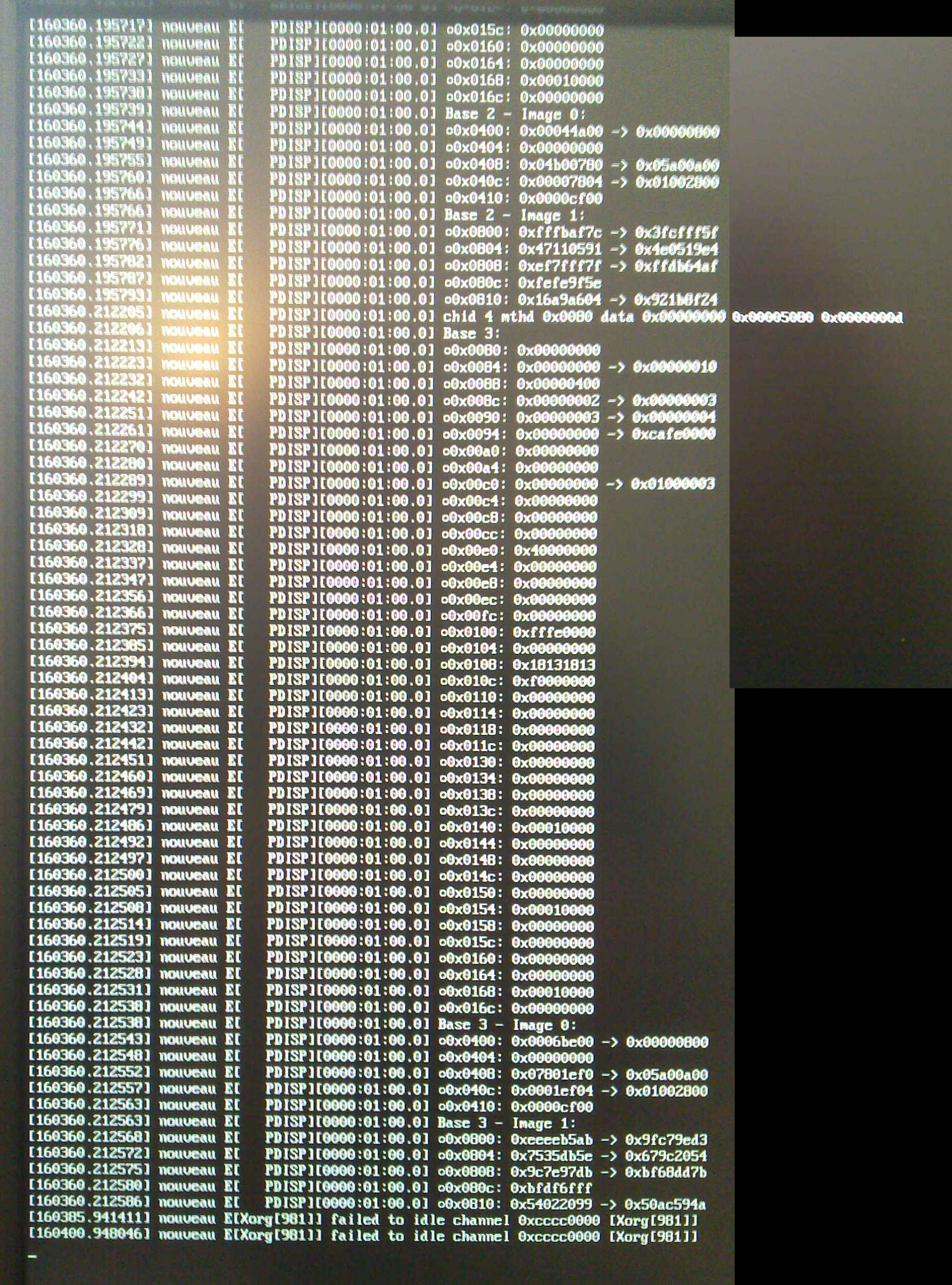 Created attachment 102212 [details] Screenshot of log output I came in to work this morning, to find two of my four monitors blank, and the other two showing the attached log output (screenshot only, because I can't find it in anywhere on the filesystem). /var/log/messages contains errors of the form: nouveau E[ PGRAPH][0000:01:00.0] TRAP ch 7 [0x007f730000 cubicgrid[18458]] nouveau E[ PGRAPH][0000:01:00.0] GPC0/TPC0/MP trap: MULTIPLE_WARP_ERRORS MEM_OUT_OF_BOUNDS cubicgrid is my screensaver (part of xscreensaver) Here's some more information that may or may not be useful. If you need any more, just ask and I'll see what I can do: localhost:~# uname -a Linux localhost.localdomain 3.16.0-rc2 #1 SMP Tue Jun 24 16:08:14 BST 2014 x86_64 x86_64 x86_64 GNU/Linux localhost:~# lspci | fgrep VGA 01:00.0 VGA compatible controller: NVIDIA Corporation GK107 [NVS 510] (rev a1) localhost:~# xrandr Screen 0: minimum 320 x 200, current 7920 x 1920, maximum 8192 x 8192 DP-1 connected 1600x1200+2560+0 (normal left inverted right x axis y axis) 408mm x 306mm 1600x1200 60.00*+ 1280x1024 60.02 1280x960 60.00 1024x768 60.00 800x600 60.32 640x480 60.00 720x400 70.08 DP-2 connected primary 2560x1440+4160+0 (normal left inverted right x axis y axis) 597mm x 336mm 2560x1440 59.95*+ 1920x1200 59.88 1920x1080 60.00 60.00 50.00 59.94 24.00 23.98 1920x1080i 60.00 50.00 59.94 1600x1200 60.00 1680x1050 59.95 1280x1024 75.02 60.02 1280x800 59.81 1152x864 75.00 1280x720 60.00 50.00 59.94 1440x576i 50.00 1024x768 75.08 60.00 1440x480i 60.00 59.94 800x600 75.00 60.32 720x576 50.00 720x480 60.00 59.94 640x480 75.00 60.00 59.94 720x400 70.08 DP-3 connected 1200x1920+6720+0 left (normal left inverted right x axis y axis) 518mm x 324mm 1920x1200 59.95*+ 1600x1200 60.00 1680x1050 59.88 1280x1024 60.02 1280x960 60.00 1024x768 60.00 800x600 60.32 640x480 60.00 720x400 70.08 DP-4 connected 2560x1440+0+0 (normal left inverted right x axis y axis) 597mm x 336mm 2560x1440 59.95*+ 1920x1200 59.88 1920x1080 60.00 60.00 50.00 59.94 24.00 23.98 1920x1080i 60.00 50.00 59.94 1600x1200 60.00 1680x1050 59.95 1280x1024 75.02 60.02 1280x800 59.81 1152x864 75.00 1280x720 60.00 50.00 59.94 1440x576i 50.00 1024x768 75.08 60.00 1440x480i 60.00 59.94 800x600 75.00 60.32 720x576 50.00 720x480 60.00 59.94 640x480 75.00 60.00 59.94 720x400 70.08 fgrep Monitor /var/log/Xorg.0.log [ 16.578] (**) | |-->Monitor "<default monitor>" [ 16.731] (II) NOUVEAU(0): Monitor name: SDM-S205F/K [ 16.737] (II) NOUVEAU(0): Monitor name: DELL U2711 [ 16.771] (II) NOUVEAU(0): Monitor name: DELL U2412M [ 16.777] (II) NOUVEAU(0): Monitor name: DELL U2713HM