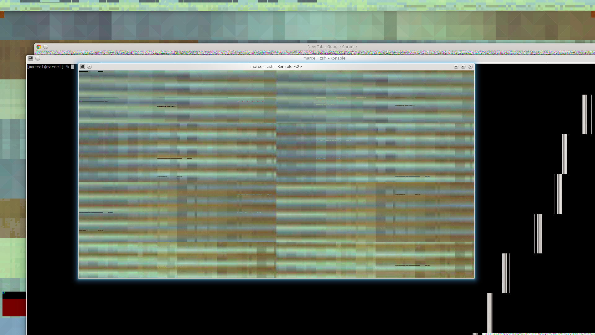 Created attachment 103116 [details] Screenshot of Gnome shell Please have a look at the screenshots. Rendering of most windows is totally garbled including window decoration. This is not about Crossfire/SLI/Multi GPU rendering, just plain single GPU. Gnome-shell's own rendering is mostly fine. Panel, lock screen animations, menus and dashboard don't show distortions. KDE's/Kwin is worse, even the panel's are broken, but it's able to draw window decorations. glxgears's rendering is fine. Linux console (no X11) is also fine. Hardware: PowerColor AX7990 6GBD5-2DHJ, which is one of those fake 7990s that actually use 2x7970 Tahiti XT on a single PCB and not 2x Malta. Other GPUs (6950/7950) were working fine with that system. Software: Fedora 19/20 (From stock LiveCD image to current updates incl. Kernel 3.15.4) There were no (drawing!) issues when I was using catalyst.