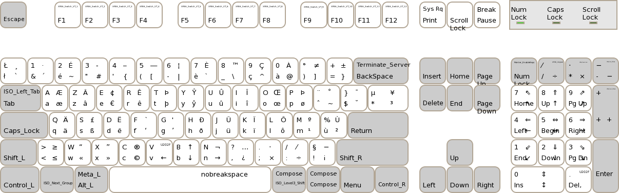 FOUR_LEVEL_KEYPAD could be modified like this: 1. If you don`t press shift nor AltGr (right alt), the behaviour is the same as the standard keypad with Server Control 2. Pressing shift and/or AltGr ignores NumLock and yields extra symbols. (I`m not smart enough to program these patches, so I`m just writing what should be in '/usr/share/X11/xkb/types/extra' file) 1. Si l`on ne touche ni shift ni AltGr (Alt droite), le clavier agit comme s`il était ordinaire (Server Contol inclus) 2. Si l`on touche shift où AltGr, des symboles supplémentaires seront genérés avec n`importe quel état de NumLock. (voici le contenu desiré du fichier '/usr/share/X11/xkb/types/extra') partial default xkb_types "default" { type "SIX_LEVEL_KEYPAD" { modifiers = Shift+NumLock+LevelThree+Control+Alt; map[None] = Level1; map[Shift] = Level3; map[NumLock] = Level2; map[Shift+NumLock] = Level3; map[LevelThree] = Level4; map[Shift+LevelThree] = Level5; map[NumLock+LevelThree] = Level4; map[Shift+NumLock+LevelThree] = Level5; map[Control+Alt] = Level6; level_name[Level1] = "Base"; level_name[Level2] = "Number"; level_name[Level3] = "Shift"; level_name[Level4] = "AltGr "; level_name[Level5] = "Shift AltGr"; level_name[Level6] = "Ctrl+Alt"; }; }; --------------- should it be possible to press shift+KP_Left for some programs to mark a region of text? If so, I could change the level assignment such that the keypad ignores any modifier (except for Ctrl+Alt) when NumLock is off. '../symbols/pc' could look like this: Est-ce qu`on a besoin de la possibilité de toucher shift+KP_Left afin de permettre aux logiciels de marquer une region de texte? Moi, je pourrais modifier ce propos de sorte qu`on ne puisse générer des symboles supplémentaires qu`avec NumLock active. Voici une possibilité de modifier le fichier '../symbols/pc': key.type[Group1]="SIX_LEVEL_KEYPAD"; %modifiers to be pressed / modificateurs à toucher: % (-) NumLock Shift AltGr Shift+AltGr Ctrl+Alt key <KPDV> {[division,division,colon, U2298,KP_Divide, XF86_Ungrab]}; key <KP9> {[KP_Prior,KP_9, noSymbol,U2168,U2468, noSymbol]}; This is not a desired key mapping, it only shows how to do it! Ceux ne sont pas les symboles desirés, il s`agit du savoir-faire. I could also include the modifiers rightControl and the Windows key if desired. Je pourrais aussi introduire les modificateurs «Contrôle, selection de groupe» et la touche fenêtre si l`on en ait besoin. Gruß, Fabian.