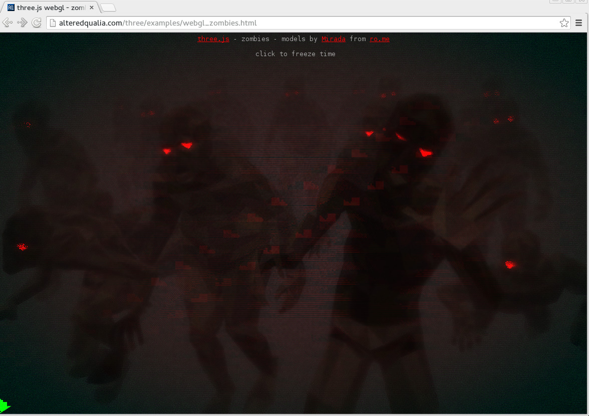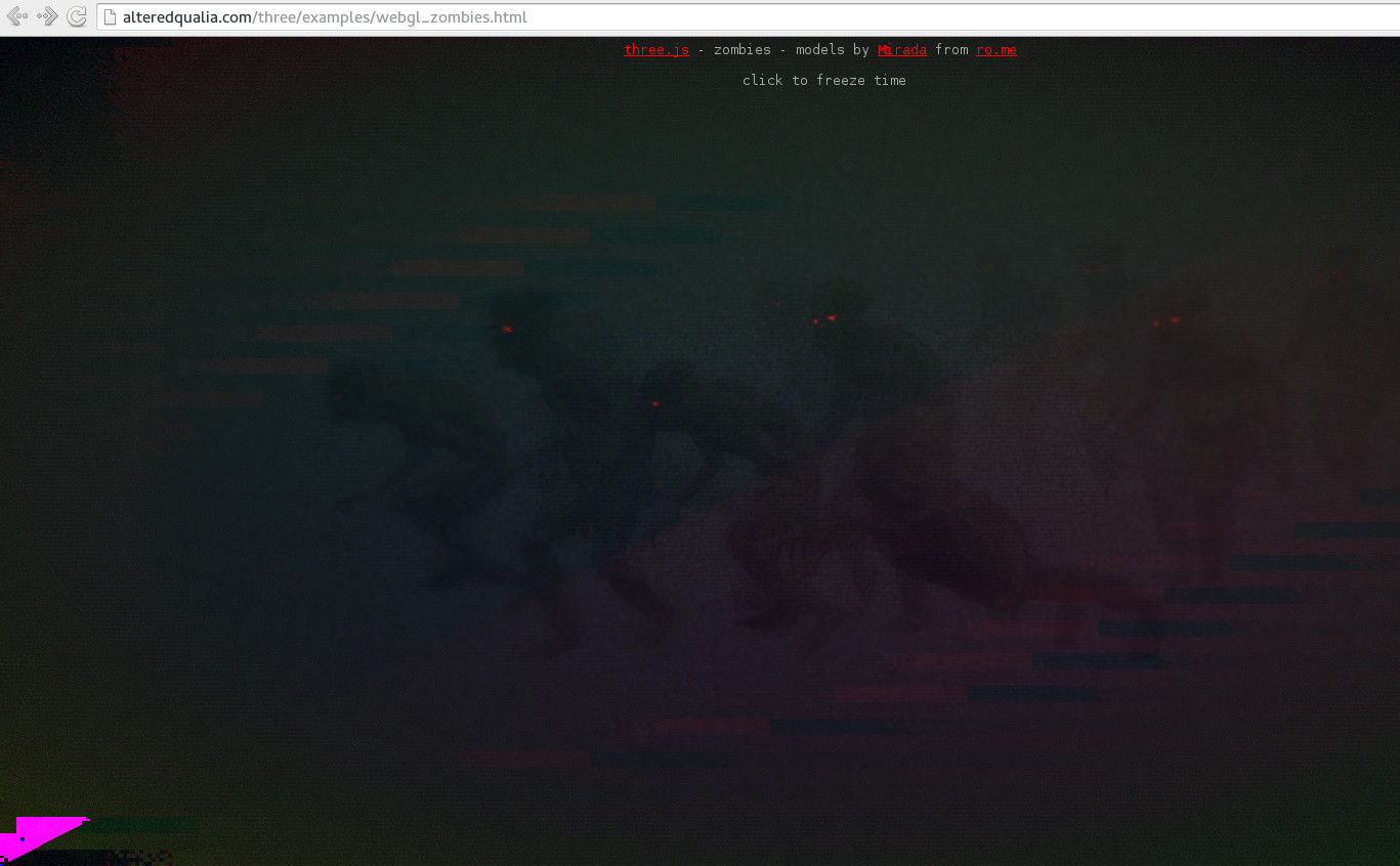 There's strange pattern and blue flickering dots within rendered image. Also a strange pink triangle at bottom: http://alteredqualia.com/three/examples/webgl_zombies.html To be honest, I did not try yet with other drivers so filing for Intel for now.
