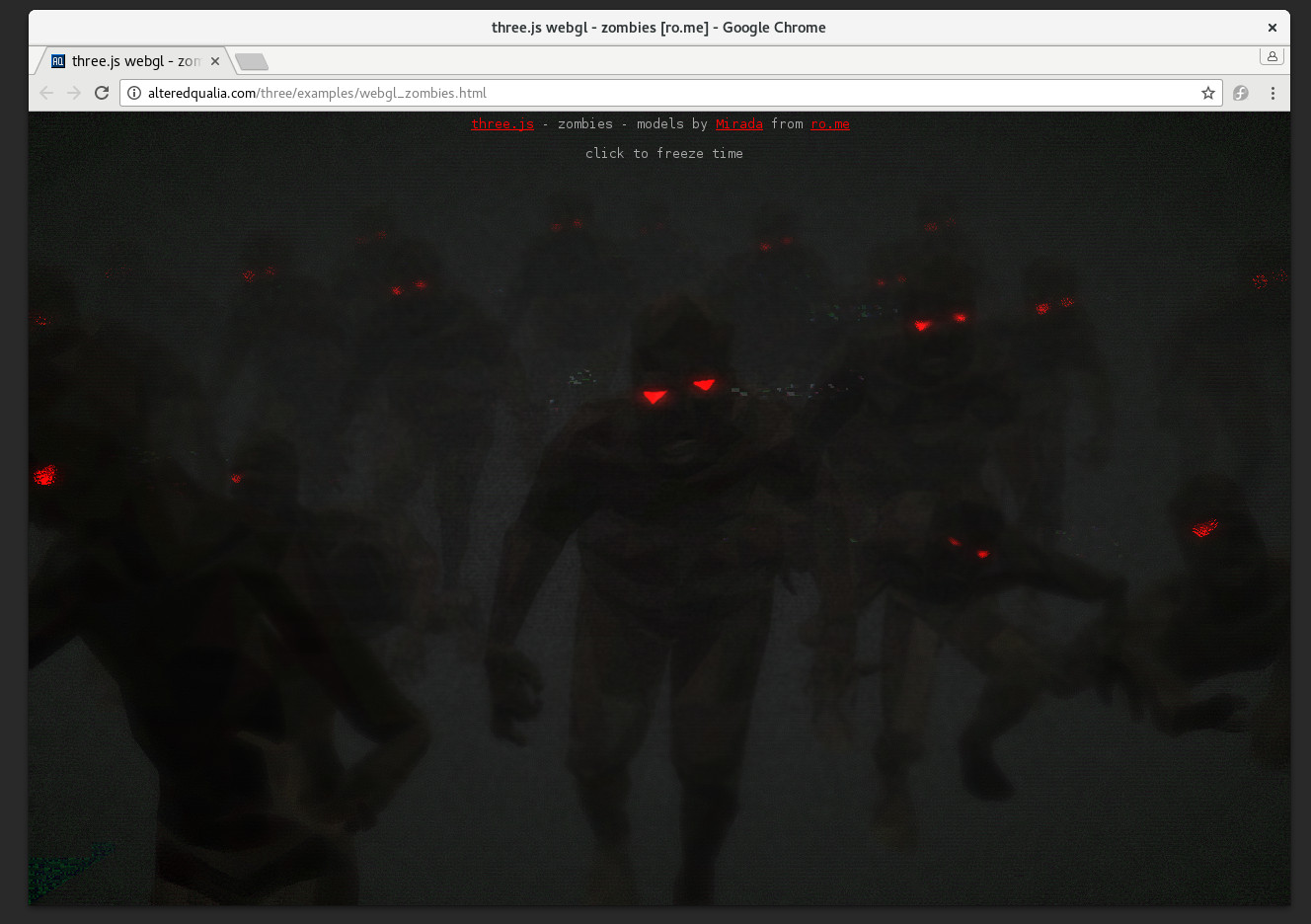 Variable add is uninitialized before operation add += color = org = texture2D( map, uv ); (line 266 in webgl_zombies.html). Initializing add or changing that line to add = color = org = texture2D( map, uv ); fixes the problem. (Setting glsl_zero_init=true before starting browser also fixes the problem.) Kind regards, Stream HPC Team https://streamhpc.com/