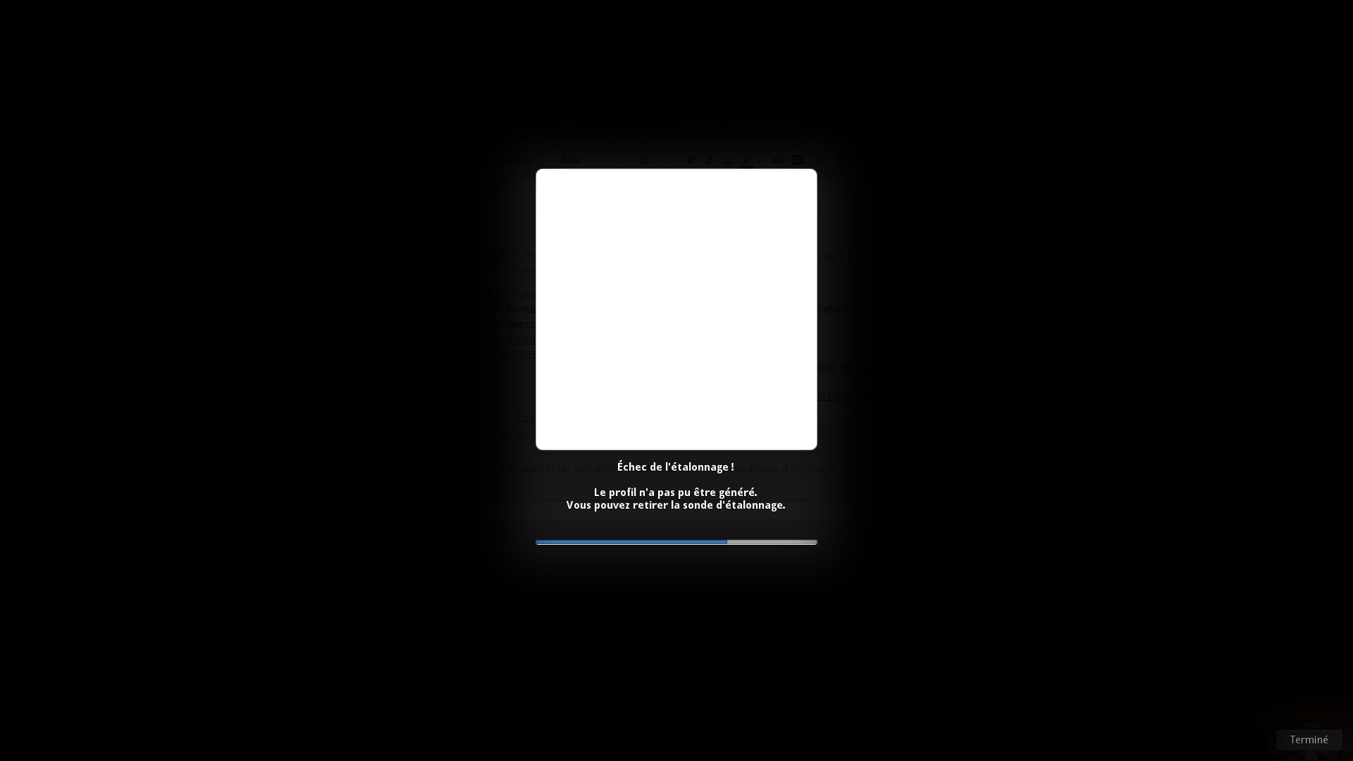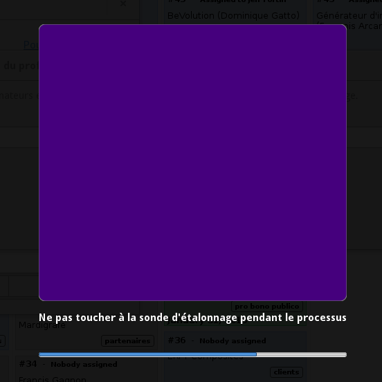 Some more thinking and investigation on IRC led to a potential insight into the cause: <nekohayo> it's interesting that it used to always hang on the same purple color target but now it's a white one... yet always around the 75% mark <hughsie> it's probably at the point it switches from calibration to charicterisation <nekohayo> oh I didn't know there were such different phases are those also present in the quick/medium modes? <hughsie> yes, but the other modes use less nodes, and so if it's a problem with maths overflowing somewhere (my suspicion) it might not happen so frequently And then I looked at the journalctl logs, below (the "Gamma correction table was non-monotonic" part is suspicious): # journalctl --since=11:00|grep -i color jan 21 11:01:41 computer org.freedesktop.ColorHelper[6031]: steps were set as [ 3, 97, -1 ] but should have been: [ 3, 97, -1 ] at cd-main.c:475 jan 21 11:04:43 computer org.freedesktop.ColorHelper[6031]: steps were set as [ 3, 97, -1 ] but should have been: [ 3, 97, -1 ] at cd-main.c:475 jan 21 11:07:27 computer org.freedesktop.ColorHelper[6031]: child is at 19/20 steps and parent done [cd-main.c:788] jan 21 11:07:27 computer org.freedesktop.ColorHelper[6031]: 2) cd-main.c:1341 (0/3) jan 21 11:07:27 computer org.freedesktop.ColorHelper[6031]: 1) cd-main.c:682 (2/5) jan 21 11:07:27 computer org.freedesktop.ColorHelper[6031]: 0) cd-main.c:766 (19/20) jan 21 11:07:27 computer org.freedesktop.ColorHelper[6031]: steps were set as [ 3, 97, -1 ] but should have been: [ 4, 96, -1 ] at cd-main.c:475 jan 21 11:07:30 computer org.freedesktop.ColorHelper[6031]: child is at 19/20 steps and parent done [cd-main.c:800] jan 21 11:07:30 computer org.freedesktop.ColorHelper[6031]: 2) cd-main.c:1341 (0/3) jan 21 11:07:30 computer org.freedesktop.ColorHelper[6031]: 1) cd-main.c:682 (2/5) jan 21 11:07:30 computer org.freedesktop.ColorHelper[6031]: 0) cd-main.c:766 (19/20) jan 21 11:07:30 computer gnome-settings-daemon.desktop[6130]: (gnome-control-center:7701): color-cc-panel-WARNING **: calibration failed with code 5: Gamma correction table was non-monotonic: 0,000000,0,000000,0,000000 0,046875,0,050000,0,046875 0,093750,0,100000,0,043750 0,140625,0,150000,0,090625 0,187500,0,200000,0,137500 0,234375,0,200000,0,184375 0,281250,0,300000,0,281250 0,353125,0,400000,0,353125 0,350000,0,400000,0,350000 0,421875,0,450000,0,396875 0,468750,0,500000,0,443750 0,540625,0,575000,0,528125 0,550000,0,600000,0,537500 0,609375,0,650000,0,584375 0,643750,0,700000,0,625000 0,678125,0,750000,0,678125 0,750000,0,800000,0,734375 0,784375,0,862500,0,790625 0,831250,0,900000,0,831250 0,890625,0,950000,0,890625 0,937500,1,000000,0,937500 jan 21 11:07:30 computer gnome-settings-daemon.desktop[6130]: (gnome-control-center:7701): color-cc-panel-WARNING **: /var/lib/gdm/.local/share/icc/edid-0b5711f7bfac0f3dd7b84ac931620244.icc is not usable by this user jan 21 11:40:36 computer gnome-settings-daemon.desktop[6130]: (gnome-settings-daemon:6130): housekeeping-plugin-WARNING **: Failed to enumerate children of /var/tmp/systemd-private-cc968cfc233b42cdbcbbaa234f3bdaa0-colord.service-a5hwqM: Permission non accordée jan 21 11:40:36 computer gnome-settings-daemon.desktop[6130]: (gnome-settings-daemon:6130): housekeeping-plugin-WARNING **: Failed to enumerate children of /var/tmp/systemd-private-b9b89e14684c4c94927139f56432f2f9-colord.service-RKhE40: Permission denied jan 21 11:40:36 computer gnome-settings-daemon.desktop[6130]: (gnome-settings-daemon:6130): housekeeping-plugin-WARNING **: Failed to enumerate children of /tmp/systemd-private-cc968cfc233b42cdbcbbaa234f3bdaa0-colord.service-bIHHuy: Permission denied jan 21 11:46:28 computer gnome-settings-daemon.desktop[6130]: (gnome-control-center:7701): color-cc-panel-WARNING **: failed to start calibrate: failed to calibrate jan 21 11:46:31 computer gnome-settings-daemon.desktop[6130]: (gnome-control-center:7701): color-cc-panel-WARNING **: /var/lib/gdm/.local/share/icc/edid-0b5711f7bfac0f3dd7b84ac931620244.icc is not usable by this user jan 21 11:46:34 computer gnome-settings-daemon.desktop[6130]: (gnome-control-center:7701): color-cc-panel-WARNING **: /var/lib/gdm/.local/share/icc/edid-0b5711f7bfac0f3dd7b84ac931620244.icc is not usable by this user jan 21 11:46:35 computer gnome-settings-daemon.desktop[6130]: (gnome-control-center:7701): color-cc-panel-WARNING **: /var/lib/gdm/.local/share/icc/edid-0b5711f7bfac0f3dd7b84ac931620244.icc is not usable by this user jan 21 11:46:42 computer gnome-control-center.desktop[9508]: (gnome-control-center:9508): color-cc-panel-WARNING **: /var/lib/gdm/.local/share/icc/edid-0b5711f7bfac0f3dd7b84ac931620244.icc is not usable by this user jan 21 12:04:33 computer sudo[10496]: jeff : TTY=pts/0 ; PWD=/home/jeff ; USER=root ; COMMAND=/bin/dnf info colord jan 21 12:40:36 computer gnome-settings-daemon.desktop[6130]: (gnome-settings-daemon:6130): housekeeping-plugin-WARNING **: Failed to enumerate children of /tmp/systemd-private-cc968cfc233b42cdbcbbaa234f3bdaa0-colord.service-bIHHuy: Permission denied jan 21 12:40:36 computer gnome-settings-daemon.desktop[6130]: (gnome-settings-daemon:6130): housekeeping-plugin-WARNING **: Failed to enumerate children of /var/tmp/systemd-private-cc968cfc233b42cdbcbbaa234f3bdaa0-colord.service-a5hwqM: Permission denied jan 21 12:40:36 computer gnome-settings-daemon.desktop[6130]: (gnome-settings-daemon:6130): housekeeping-plugin-WARNING **: Failed to enumerate children of /var/tmp/systemd-private-b9b89e14684c4c94927139f56432f2f9-colord.service-RKhE40: Permission denied