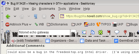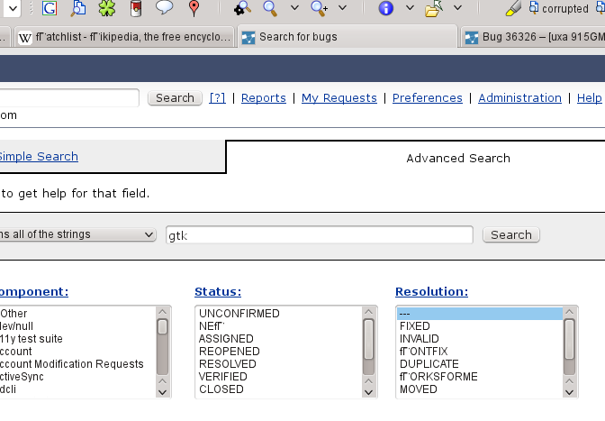 After running my system for some time (several hours or days), certain text characters in GTK+ applications become blank or garbled. This renders these applications completely unusable until I restart. (See the attached screenshots.) Qt applications are unaffected. I'm not sure if this is related, but in addition to the font corruption, sometimes I get black boxes or black streaking over non-text elements of GTK+ applications. It's not clear to me what the cause of the problem is. There's a Debian bug report at <https://bugs.debian.org/cgi-bin/bugreport.cgi?bug=760435> which suggests that the problem is in libglib. However, there are also several freedesktop.org bug reports for the Intel video driver which describe similar symptoms. In particular, my font corruption looks just like Attachment 35720 [details] of Bug 28151 and Attachment 37173 [details] of Bug 20560. I think it's more likely a problem with the Intel driver than with libglib, since I didn't notice any problems after my last update to libglib (from 2.38.2 to 2.42.0 on 3 December 2014) but I did start enountering this problem after migrating my OS from a system with an Nvidia card to one with a Core Processor Integrated Graphics Controller. I am running KDE 4.14.3 on openSUSE 13.2 for x86-64. I am using xorg 7.6 and version 2.99.916 of the i915 driver. My graphics card is a Elsewhere on the web this problem has been reported on ArchLinux and Kubuntu: <https://bbs.archlinux.org/viewtopic.php?id=186783> I have reported the problem downstream on the openSUSE bug tracker: <https://bugzilla.novell.com/show_bug.cgi?id=913425>