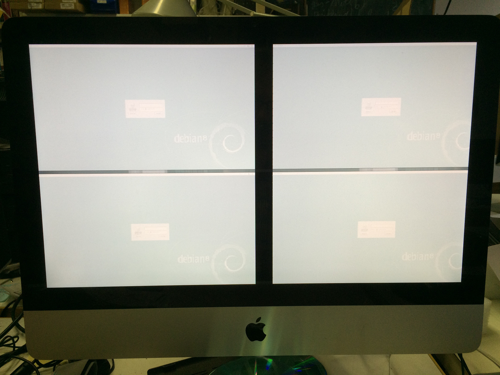 Created attachment 112830 [details] Screenshot of the scrambled display on the iMac 21.5" Late 2009 Hello! I recently did a fresh install of Debian Jessie on a late 2009 Apple iMac 21.5" which has an ATI Radeon Mobility HD 4670 (model: A1311). The video display on this machine looks scrambled, particularly, one can see the framebuffer four times on the display as if looking at an overview of four virtual desktops with extremely low contrast and no color. The image of each these views is basically white but visible with the bare eye. I am attaching a screenshot for reference as well as the appropriate logs files. More specs on the machine can be found in this Debian installation report [1]. Cheers, Adrian > [1] https://bugs.debian.org/cgi-bin/bugreport.cgi?bug=776215
