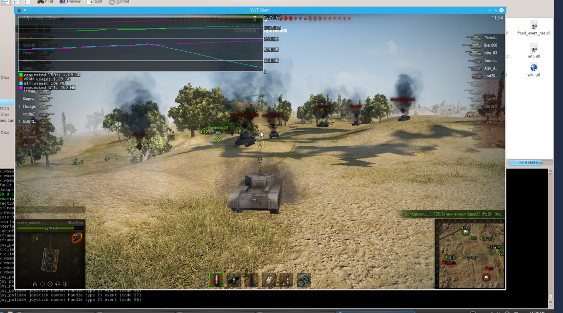 This happens when WOT crashes: Jun 10 22:00:42 localhost kernel: radeon 0000:01:00.0: ring 3 stalled for more than 10223msec Jun 10 22:00:42 localhost kernel: radeon 0000:01:00.0: GPU lockup (current fence id 0x000000000007d968 last fence id 0x000000000007d9d4 on ring 3) Jun 10 22:00:42 localhost kernel: radeon 0000:01:00.0: failed to get a new IB (-35) Jun 10 22:00:42 localhost kernel: [drm:radeon_cs_ioctl [radeon]] *ERROR* Failed to get ib ! Jun 10 22:00:43 localhost kernel: radeon 0000:01:00.0: Saved 2001 dwords of commands on ring 0. Jun 10 22:00:43 localhost kernel: radeon 0000:01:00.0: GPU softreset: 0x000000CD Jun 10 22:00:43 localhost kernel: radeon 0000:01:00.0: GRBM_STATUS = 0xB2527028 Jun 10 22:00:43 localhost kernel: radeon 0000:01:00.0: GRBM_STATUS_SE0 = 0x0F800006 Jun 10 22:00:43 localhost kernel: radeon 0000:01:00.0: GRBM_STATUS_SE1 = 0x0F800006 Jun 10 22:00:43 localhost kernel: radeon 0000:01:00.0: SRBM_STATUS = 0x200046C0 Jun 10 22:00:43 localhost kernel: radeon 0000:01:00.0: SRBM_STATUS2 = 0x00000000 Jun 10 22:00:43 localhost kernel: radeon 0000:01:00.0: R_008674_CP_STALLED_STAT1 = 0x00000000 Jun 10 22:00:43 localhost kernel: radeon 0000:01:00.0: R_008678_CP_STALLED_STAT2 = 0x40000000 Jun 10 22:00:43 localhost kernel: radeon 0000:01:00.0: R_00867C_CP_BUSY_STAT = 0x00408006 Jun 10 22:00:43 localhost kernel: radeon 0000:01:00.0: R_008680_CP_STAT = 0x84228647 Jun 10 22:00:43 localhost kernel: radeon 0000:01:00.0: R_00D034_DMA_STATUS_REG = 0x60C83146 Jun 10 22:00:43 localhost kernel: radeon 0000:01:00.0: R_00D834_DMA_STATUS_REG = 0x44C83D57 Jun 10 22:00:43 localhost kernel: radeon 0000:01:00.0: VM_CONTEXT1_PROTECTION_FAULT_ADDR 0x00000000 Jun 10 22:00:43 localhost kernel: radeon 0000:01:00.0: VM_CONTEXT1_PROTECTION_FAULT_STATUS 0x00000000 Jun 10 22:00:44 localhost kernel: radeon 0000:01:00.0: GRBM_SOFT_RESET=0x0000DDFF Jun 10 22:00:44 localhost kernel: radeon 0000:01:00.0: SRBM_SOFT_RESET=0x00108100 Jun 10 22:00:44 localhost kernel: radeon 0000:01:00.0: GRBM_STATUS = 0x00003028 Jun 10 22:00:44 localhost kernel: radeon 0000:01:00.0: GRBM_STATUS_SE0 = 0x00000006 Jun 10 22:00:44 localhost kernel: radeon 0000:01:00.0: GRBM_STATUS_SE1 = 0x00000006 Jun 10 22:00:44 localhost kernel: radeon 0000:01:00.0: SRBM_STATUS = 0x20000AC0 Jun 10 22:00:44 localhost kernel: radeon 0000:01:00.0: SRBM_STATUS2 = 0x00000000 Jun 10 22:00:44 localhost kernel: radeon 0000:01:00.0: R_008674_CP_STALLED_STAT1 = 0x00000000 Jun 10 22:00:44 localhost kernel: radeon 0000:01:00.0: R_008678_CP_STALLED_STAT2 = 0x00000000 Jun 10 22:00:44 localhost kernel: radeon 0000:01:00.0: R_00867C_CP_BUSY_STAT = 0x00000000 Jun 10 22:00:44 localhost kernel: radeon 0000:01:00.0: R_008680_CP_STAT = 0x00000000 Jun 10 22:00:44 localhost kernel: radeon 0000:01:00.0: R_00D034_DMA_STATUS_REG = 0x44C83D57 Jun 10 22:00:44 localhost kernel: radeon 0000:01:00.0: R_00D834_DMA_STATUS_REG = 0x44C83D57 Jun 10 22:00:44 localhost kernel: radeon 0000:01:00.0: GPU reset succeeded, trying to resume Jun 10 22:00:49 localhost kernel: [drm:atom_op_jump [radeon]] *ERROR* atombios stuck in loop for more than 5secs aborting Jun 10 22:00:49 localhost kernel: [drm:atom_execute_table_locked [radeon]] *ERROR* atombios stuck executing C674 (len 254, WS 0, PS 4) @ 0xC69E Jun 10 22:00:49 localhost kernel: [drm:atom_execute_table_locked [radeon]] *ERROR* atombios stuck executing BD60 (len 90, WS 0, PS 8) @ 0xBDA5 Jun 10 22:00:49 localhost kernel: [drm] probing gen 2 caps for device 1022:9603 = 300d02/0 Jun 10 22:00:49 localhost kernel: [drm] PCIE gen 2 link speeds already enabled Jun 10 22:00:49 localhost kernel: radeon 0000:01:00.0: Wait for MC idle timedout !