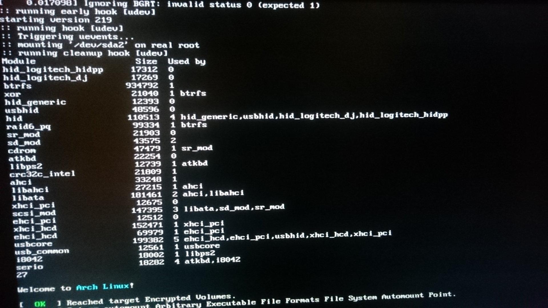 Created attachment 115307 [details] modified "hook" script for reproducing issue So i add `lsmod` and `lsmod | wc -l` after the "early" udevd is exited to see the (number of) modules get loaded, and by toggling `sleep 1` you can see they change despite the `udevadm settle` command. Four screenshots from two test cases will follow. The two cases aim to show that it's not a module-specific problem. The difference of the two cases is the port being used by my two usb hid receivers: In case 1 Receiver A use Port 13 and Receiver B use Port 14; In case 2 Receiver A use port 14 and Receiver B use Port 13.