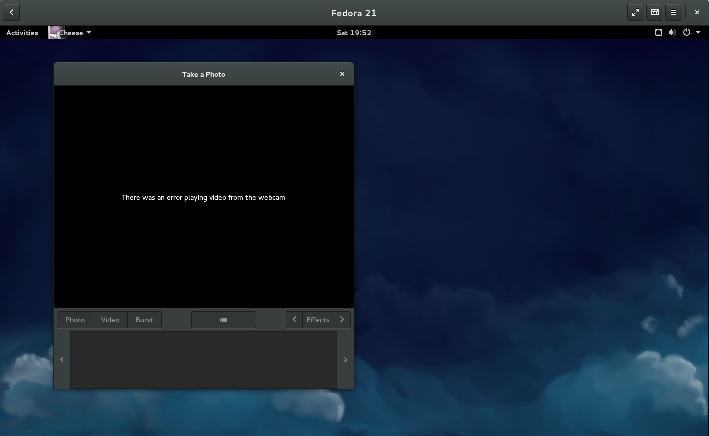 The error on Cheese commandline in the guest is: (cheese:1672): cheese-WARNING **: Could not read from resource.: gstv4l2bufferpool.c(1023): gst_v4l2_buffer_pool_poll (): /GstCameraBin:camerabin/GstWrapperCameraBinSrc:camera_source/GstBin:bin35/GstV4l2Src:video_source: poll error 1: Input/output error (5) dmesg |tail on the other hand seems to show everything is fine: [ 15.257392] USB Video Class driver (1.1.1) [ 17.454421] usb 4-2.3: USB disconnect, device number 3 [ 21.389677] usb 4-2.3: new full-speed USB device number 4 using uhci_hcd [ 21.843900] usb 4-2.3: not running at top speed; connect to a high speed hub [ 21.957308] usb 4-2.3: New USB device found, idVendor=04f2, idProduct=b39a [ 21.957311] usb 4-2.3: New USB device strings: Mfr=1, Product=2, SerialNumber=0 [ 21.957312] usb 4-2.3: Product: Integrated Camera [ 21.957314] usb 4-2.3: Manufacturer: SunplusIT INC. [ 21.966975] uvcvideo: Found UVC 1.00 device Integrated Camera (04f2:b39a) [ 22.009469] input: Integrated Camera as /devices/pci0000:00/0000:00:05.2/usb4/4-2/4-2.3/4-2.3:1.0/input/input10